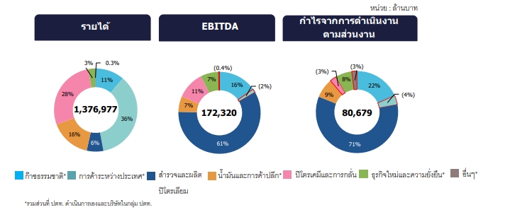 ธุรกิจปิโตรเคมี มีผลการดำเนินงานลดลง โดยหลักมาจากกลุ่มโอเลฟินส์ เนื่องจากต้นทุนวัตถุดิบที่ปรับเพิ่มขึ้น แม้ว่าปริมาณขายจะเพิ่มขึ้น กลุ่มธุรกิจการค้าระหว่างประเทศ มีผลการดำเนินงานปรับลดลงจากการรับรู้ขาดทุนจากการ Mark-to-market ของสินค้าระหว่างการขนส่ง และส่วนต่างของราคาซื้อขายผลิตภัณฑ์ที่ปรับตัวลดลง กลุ่มธุรกิจน้ำมันและการค้าปลีก มีผลการดำเนินงานลดลงเช่นกัน โดยหลักจากกำไรขั้นต้นเฉลี่ยต่อลิตรของน้ำมันอากาศยานและน้ำมันเบนซินที่ปรับลดลง กลุ่มธุรกิจก๊าซธรรมชาติ มีผลการดำเนินงานลดลงเช่นกัน โดยหลักจาก ธุรกิจโรงแยกก๊าซฯ มีกำไรขั้นต้นลดลงจากราคาขายเฉลี่ยที่ปรับลดลงตามราคาอ้างอิง แม้ว่าปริมาณขายรวมจะเพิ่มขึ้น ธุรกิจจัดหาและค้าส่งก๊าซฯ มีกำไรขั้นต้นเพิ่มขึ้นจากต้นทุนก๊าซฯ ที่ปรับลดลงตามราคา Pool Gas
