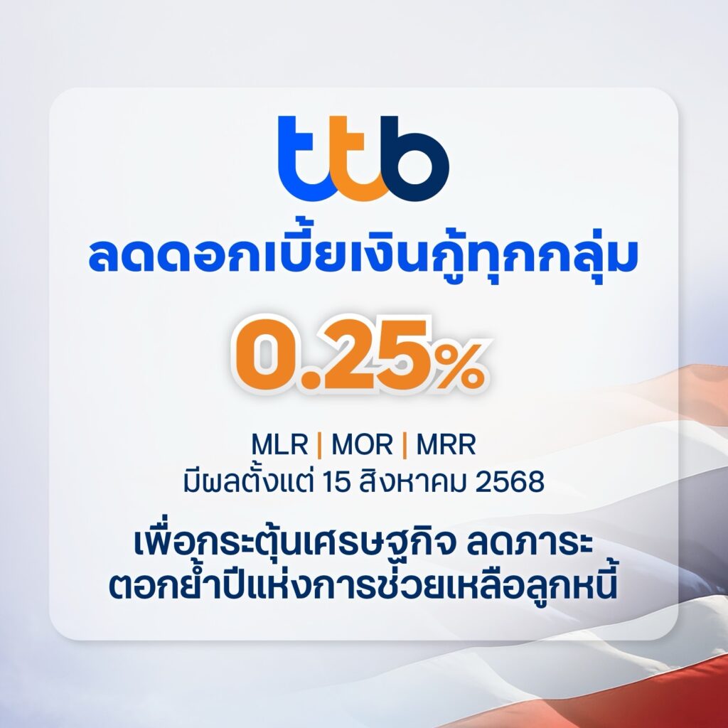 นายปิติ ตัณฑเกษม ประธานเจ้าหน้าที่บริหาร ทีเอ็มบีธนชาต หรือ ทีทีบี กล่าวว่า ทีทีบี พร้อมอยู่เคียงข้างและให้การสนับสนุนทางการเงินแก่ลูกค้าทุกกลุ่มในทุกสถานการณ์มาโดยตลอด โดยเฉพาะในช่วงนี้ที่สภาพเศรษฐกิจเปราะบางจากปัจจัยภายในและนอกประเทศ อาทิ ความเสี่ยงที่เพิ่มขึ้นจากมาตรการภาษีสหรัฐในช่วงครึ่งปีหลังที่กระทบต่อความสามารถในการแข่งขันของภาคธุรกิจ ผลพวงจากจำนวนนักท่องเที่ยวต่างชาติที่มีแนวโน้มลดลง อีกทั้งปัญหาหนี้ครัวเรือนที่รายได้ไม่สัมพันธ์กับรายจ่ายยังคงเป็นปัญหาเรื้อรังล้วนเป็นปัจจัยที่กดดันให้เศรษฐกิจไทยมีแนวโน้มปรับตัวลง เพื่อเป็นการสอดรับกับมติ กนง. ที่ต้องการช่วยเพิ่มความผ่อนคลาย กระตุ้นการฟื้นตัวของเศรษฐกิจ และช่วยบรรเทาไม่ให้ค่าครองชีพของลูกค้าและต้นทุนของธุรกิจยิ่งสูงไปกว่านี้ ทีทีบี จึงได้พิจารณาปรับลดอัตราดอกเบี้ยเงินกู้ลง 0.25% ต่อปีเพื่อช่วยเหลือลูกค้าทุกกลุ่มตั้งแต่รายย่อย ผู้ประกอบการเอสเอ็มอี และกลุ่มลูกค้าธุรกิจ สำหรับผลิตภัณฑ์สินเชื่อที่อ้างอิงอัตราดอกเบี้ย MLR, MOR และ MRR โดยมีผลตั้งแต่วันที่ 15 ส.ค.2568