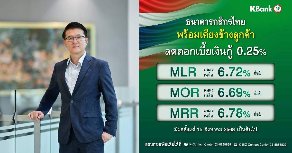 กรุงเทพฯ 14 ส.ค. – ธ.กสิกรไทย ประกาศปรับลดอัตราดอกเบี้ยเงินกู้ทั้ง MLR MOR และ MRR ลงร้อยละ 0.25 ต่อปี มีผล 15 ส.ค. 2568 เพื่อสนับสนุนการขับเคลื่อนเศรษฐกิจไทยที่มีแนวโน้มชะลอตัวช่วงครึ่งปีหลัง ท่ามกลางความเปราะบางที่เพิ่มขึ้น จากความไม่แน่นอนของสถานการณ์การค้าโลก มาตรการภาษีสหรัฐฯ ภาคท่องเที่ยวชะลอตัว และอัตราเงินเฟ้อที่ยังอยู่ในระดับต่ำต่อเนื่อง
