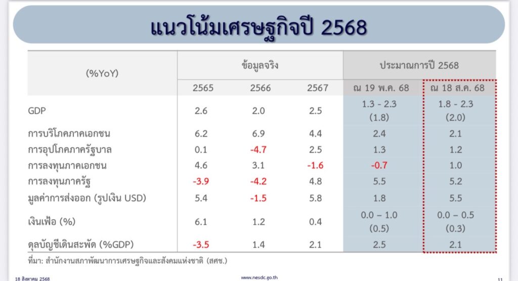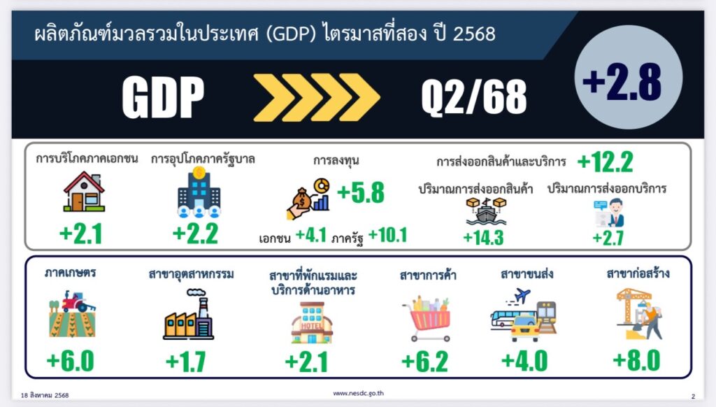 นายดนุชา พิชยนันท์ เลขาธิการสภาพัฒนาการเศรษฐกิจและสังคมแห่งชาติ (สศช.) แถลงภาวะเศรษฐกิจไทยไตรมาสที่ 2 ของปี 2568 โดยผลิตภัณฑ์มวลรวมในประเทศ (GDP) ไตรมาสที่ 2 ขยายตัวร้อยละ 2.8 ชะลอลงจากการขยายตัวร้อยละ 3.2 ในไตรมาสแรกของปี 2568 โดยเป็นผลมาจากการใช้จ่าย การส่งออกสินค้าขยายตัวในเกณฑ์สูงต่อเนื่อง การลงทุนภาคเอกชนกลับมาขยายตัวขณะที่การอุปโภคบริโภคภาคเอกชน การใช้จ่ายเพื่อการอุปโภคของรัฐบาล การลงทุนภาครัฐ และการส่งออกบริการขยายตัวชะลอลง รวมครึ่งแรกของปี 2568 เศรษฐกิจไทยขยายตัวร้อยละ 3.0 ส่วนเศรษฐกิจไทยไตรมาส 3 คาดว่าจะยังขยายตัวได้ดี แต่จะขยายตัวต่ำกว่าช่วง 2 ไตรมาสแรกของปี