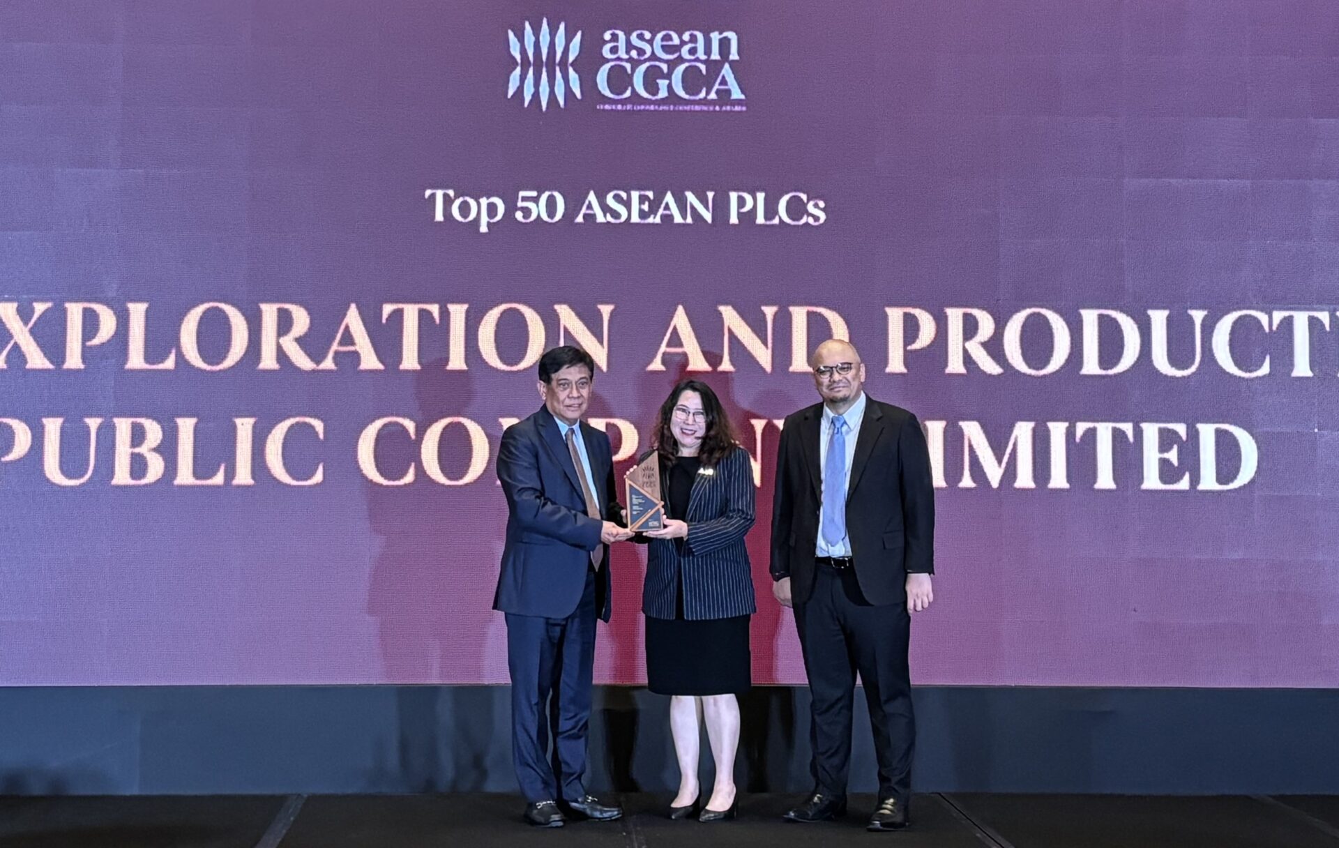 บริษัท ปตท.สำรวจและผลิตปิโตรเลียม จำกัด (มหาชน) หรือ ปตท.สผ. โดย น.ส.ชลิดา ศรีกรกุล (กลาง) ผู้จัดการอาวุโส ฝ่ายกำกับดูแลองค์กรและบริหารงานบริษัทย่อย รับมอบรางวัล Top 50 ASEAN PLCs และ Top 5 PLCs from Thailand ในฐานะ 1 ใน 50 บริษัทจดทะเบียนในภูมิภาคอาเซียน และ 1 ใน 5 บริษัทจดทะเบียนจากประเทศไทย ที่มีการกำกับดูแลกิจการที่ดีจากการประเมิน ASEAN Corporate Governance Scorecard ประจำปี 2567 โดยมี Atty. Francisco Edralin Lim Chair, ASEAN Capital Markets Forum (ACMF) Working Group on Corporate Governance และ Dr. Ismet Yusoff (ขวา) ประธานเจ้าหน้าที่บริหาร Minority Shareholders Watch Group (MSWG) ให้เกียรติมอบรางวัล ในงาน ASEAN Corporate Governance Conference & Awards ประจำปี 2568 ซึ่งจัดขึ้น ณ กรุงกัวลาลัมเปอร์ ประเทศมาเลเซีย