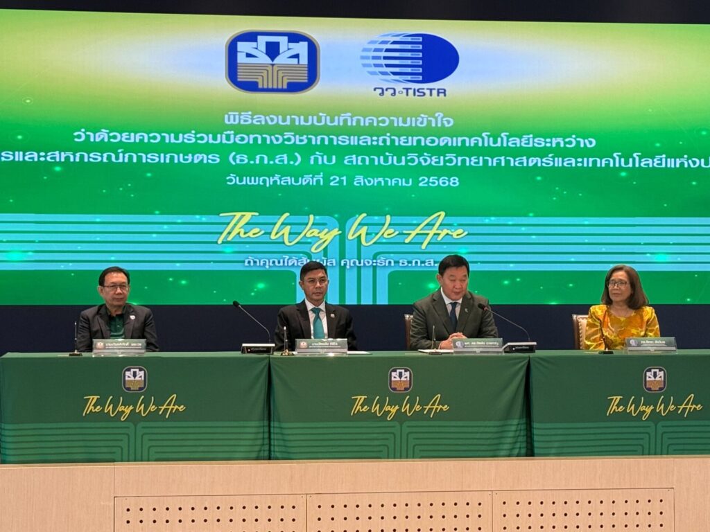 ธนาคารเพื่อการเกษตรและสหกรณ์การเกษตร (ธ.ก.ส.) ร่วมกับสถาบันวิจัยวิทยาศาสตร์และเทคโนโลยีแห่งประเทศไทย (วว.) ลงนามบันทึกความเข้าใจ (MOU) ว่าด้วยความร่วมมือทางวิชาการและถ่ายทอดเทคโนโลยี เพื่อร่วมกันบูรณาการและถ่ายทอดองค์ความรู้ในด้านวิทยาศาสตร์ เทคโนโลยี นวัตกรรม ในการเพิ่มศักยภาพและความสามารถในการแข่งขันของเกษตรกรและผู้ประกอบธุรกิจในภาคการเกษตร โดยเฉพาะเกษตรกรรุ่นใหม่ ให้สามารถนำความรู้ไปใช้ประโยชน์ในการผลิต การแปรรูป การเพิ่ม ผลผลิตการตลาด ป้องกันบรรเทาปัญหาของเกษตรกร และการสร้างมูลค่าเพิ่มแก่ผลผลิตทางการเกษตร ส่งเสริมให้เกษตรกรใช้ประโยชน์จากงานบริการด้านวิทยาศาสตร์ และเทคโนโลยี รวมถึงการรับรองมาตรฐานการผลิต เพื่อสร้างความเข้มแข็งให้แก่เกษตรกรในการประกอบอาชีพเกษตรกรรมได้อย่างมั่งคงและยั่งยืน ซึ่ง ธ.ก.ส. จะสนับสนุนด้านการเข้าถึงแหล่งเงินทุน บริการทางการเงิน พร้อมด้วยองค์ความรู้การประกอบธุรกิจแก่เกษตรกรและผู้ประกอบการ โดยมีนายฉัตรชัย ศิริไล ผู้จัดการ ธ.ก.ส. และ ผศ.ดร.วีรชัย อาจหาญ ผู้ว่าการ วว.กระทรวงการอุดมศึกษา วิทยาศาสตร์ วิจัยและนวัตกรรม (อว.) เป็นผู้ลงนาม