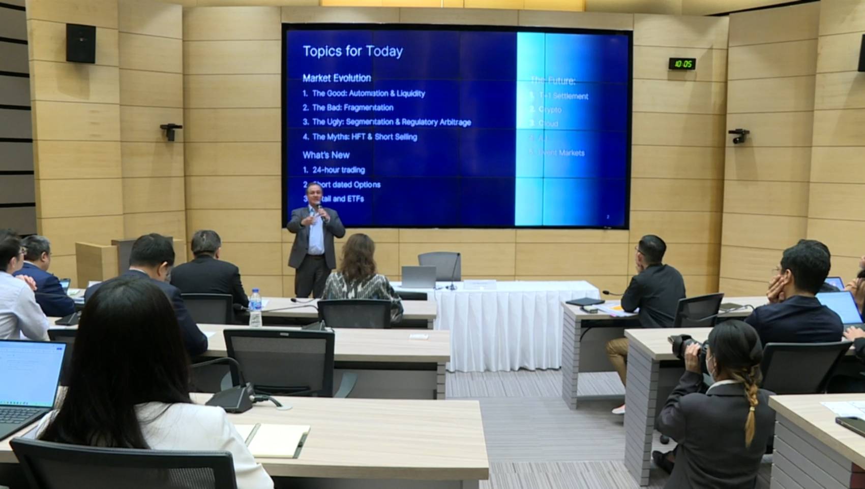 ตลาดหลักทรัพย์แห่งประเทศไทย (ตลท.) จัดงาน “The Future of Securities Markets and Trading” Evolution, Automation, and Innovations บรรยายโดย Mr.Phil Mackintosh – Chief Economist , Nasdaq Inc. ถึงประเด็น อนาคตโครงสร้างตลาดทุนและการซื้อขาย ของตลาดทุนทั่วโลกโดยยกตัวอย่างตลาดหุ้นสหรัฐอเมริกาที่ถือเป็นตลาดชั้นนำของโลกถึงพัฒนาการและทิศทางในอนาคต นอกจากนี้ ยังกล่าวถึงเทคโนโลยีและนวัตกรรมการซื้อขายในอนาคต อาทิ ความเร็วในการส่งคำสั่ง HFT สภาพคล่อง และการซื้อขาย 24 ชั่วโมง การขยายการลงทุนในสินทรัพย์ต่างๆ เช่น คริปโตเคอเรนซี่ และอนุพันธ์ต่างๆ รวมถึงการเติบโตของนักลงทุนรายย่อยในตลาดสหรัฐฯ