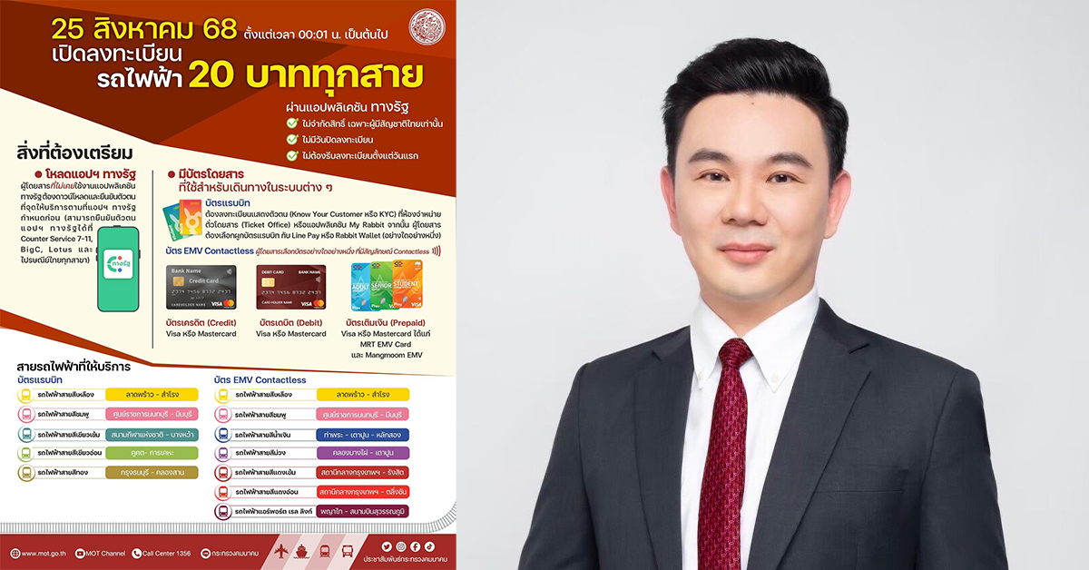นายกฤชนนท์ อัยยปัญญา ผู้ช่วยรัฐมนตรีประจำกระทรวงคมนาคม ในฐานะโฆษกกระทรวงคมนาคม เปิดเผยถึงมาตรการอัตราค่าโดยสารรถไฟฟ้าสูงสุด 20 บาท (20 บาทตลอดสาย) ว่าวันนี้ ( 26 สิงหาคม 2568 ) ช่วงเวลาประมาณ 08.06 น. ได้มีผู้ลงทะเบียนรับสิทธิ์เข้าร่วมโครงการผ่านแอป “ทางรัฐ” แล้ว 200,583 คน หลังจากเปิดให้ลงทะเบียนวันที่ 25 สิงหาคม 2568 เวลา 00.01 น. นอกจากนี้ยังมั่นใจว่าจำนวนผู้ลงทะเบียนจะเพิ่มขึ้นอย่างต่อเนื่อง ซึ่งแน่นอนว่า นโยบาย “รถไฟฟ้า 20 บาท ตลอดสาย“ ประชาชนจะได้ประโยชน์สูงสุดในทุกด้านอย่างแน่นอน