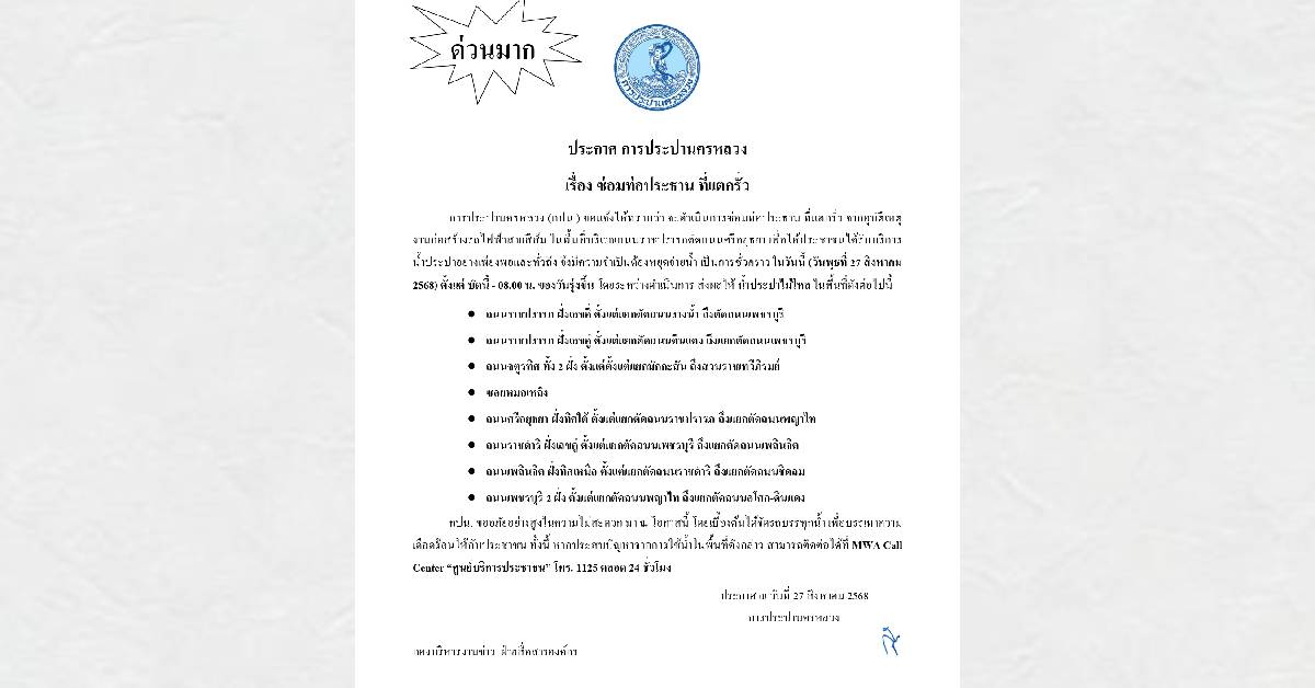 กรุงเทพฯ 27 ส.ค. – การประปานครหลวง (กปน.) ขอแจ้งให้ทราบว่า จะดำเนินการซ่อมท่อประธาน ที่แตกรั่ว จากอุบัติเหตุงานก่อสร้างรถไฟฟ้าสายสีส้ม ในพื้นที่บริเวณถนนราชปรารภตัดถนนศรีอยุธยา เพื่อให้ประชาชนได้รับบริการน้ำประปาอย่างเพียงพอและทั่วถึง จึงมีความจำเป็นต้องหยุดจ่ายน้ำ เป็นการชั่วคราว ในวันนี้ (วันพุธที่ 27 สิงหาคม 2568) ตั้งแต่ บัดนี้ – 08.00 น. ของวันรุ่งขึ้น โดยระหว่างดำเนินการ ส่งผลให้ น้ำประปาไม่ไหล ในพื้นที่ดังต่อไปนี้