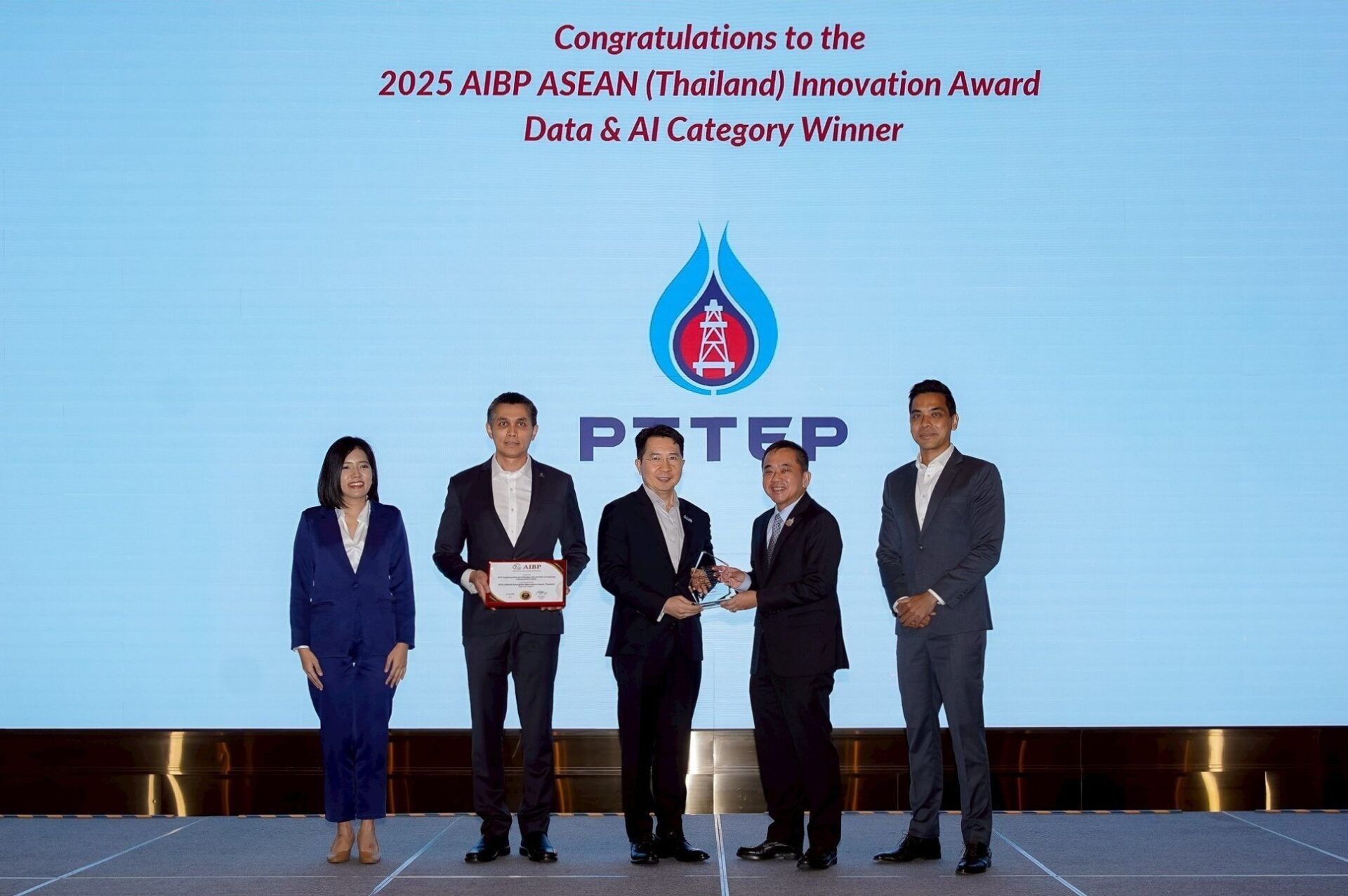 บริษัท ปตท.สำรวจและผลิตปิโตรเลียม จำกัด (มหาชน) หรือ ปตท.สผ. โดยนายธนสิทธิ์ วิชัยไพโรจน์วงศ์ ผู้ช่วยกรรมการผู้จัดการใหญ่ สายงานความเป็นเลิศด้านเทคโนโลยีดิจิทัล รับมอบรางวัล AIBP ASEAN Enterprise Innovation Award 2025 ในสาขา Data & AI จากศาสตราจารย์พิเศษวิศิษฏ์ วิศิษฏ์สรอรรถ ปลัดกระทรวงดิจิทัลเพื่อเศรษฐกิจและสังคม และ Mr. Irza Suprapto Director, ASEAN Innovation Business Platform (AIBP) ภายในงาน AIBP Conference & Exhibition 2025 โดย ปตท.สผ. เป็น 1 ใน 2 บริษัทไทยที่ได้รับรางวัลดังกล่าว จากการที่ ปตท.สผ. ได้นำเทคโนโลยีปัญญาประดิษฐ์ (AI) มาใช้ยกระดับประสิทธิภาพการดำเนินงาน เพิ่มความแม่นยำ ลดระยะเวลาและค่าใช้จ่ายในการบำรุงรักษาอุปกรณ์การผลิตในโครงการสำรวจและผลิตปิโตรเลียมต่าง ๆ พิธีมอบรางวัลจัดขึ้นที่โรงแรมอีสติน แกรนด์ พญาไท กรุงเทพฯ