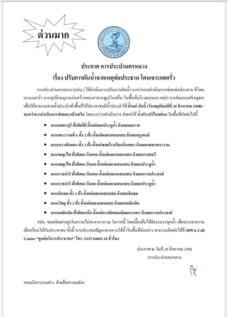 การประปานครหลวง (กปน.) ประกาศปรับการผันน้ำจากเหตุท่อประธานโดนเจาะแตกรั่ว การประปานครหลวง (กปน.) ได้ดำเนินการปรับการผันน้ำ ระหว่างรอดำเนินการซ่อมท่อประธานที่โดนเจาะแตกรั่วจากอุบัติเหตุงานก่อสร้างของสาธารณูปโภคอื่นในพื้นที่บริเวณถนนราชปรารภตัดถนนศรีอยุธยา เพื่อให้สามารถจ่ายน้ำประปาเข้าพื้นที่ให้ประชาชนมีน้ำประปาใช้ ตั้งแต่ บัดนี้ (28 ส.ค.) จนกว่าการดำเนินการซ่อมจะแล้วเสร็จ