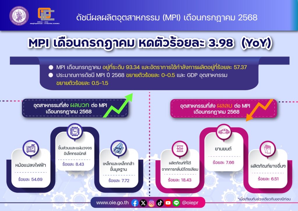 กรุงเทพฯ 28 ส.ค. – สำนักงานเศรษฐกิจอุตสาหกรรม (สศอ.) เผยดัชนีผลผลิตอุตสาหกรรม (MPI) เดือนกรกฎาคม 2568 อยู่ที่ระดับ 93.34 หดตัวร้อยละ 3.98 เมื่อเทียบกับช่วงเดียวกันของปีก่อน รับแรงกดดันจากการผลิตรถยนต์หดตัว ปัญหาหนี้ครัวเรือนยังอยู่ในระดับสูง รวมถึงผู้บริโภคมีความระมัดระวังในการใช้จ่ายมากขึ้น ส่งผลกระทบต่อยอดขายสินค้าในภาคอุตสาหกรรม