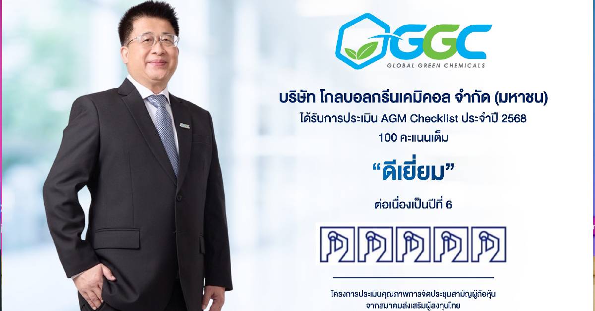 บริษัท โกลบอลกรีนเคมิคอล จำกัด (มหาชน) หรือ GGC ได้รับคะแนนการประเมินคุณภาพการจัดประชุมสามัญผู้ถือหุ้น (AGM Checklist) ประจำปี 2568 ในระดับ “ดีเยี่ยมสมควรเป็นตัวอย่าง” (5 เหรียญ) ด้วยคะแนนเต็ม 100 คะแนน จากสมาคมส่งเสริมผู้ลงทุนไทย ร่วมมือกับสำนักงานคณะกรรมการกำกับหลักทรัพย์และตลาดหลักทรัพย์ และสมาคมบริษัทจดทะเบียน สะท้อนความโปร่งใสด้านธรรมาภิบาล การคุ้มครองสิทธิผู้ถือหุ้น และการเปิดเผยข้อมูลอย่างครบถ้วนตามหลักการกำกับดูแลกิจการที่ดี