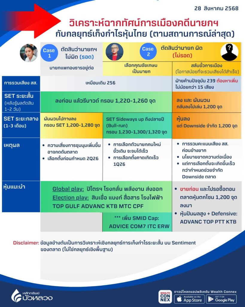 Scenario 2: ศาลชี้ผิด → นายกฯ ต้องพ้นตำแหน่ง (เปลี่ยนผู้นำ/ตั้งใหม่) + งบ ประมาณสะดุดระยะสั้น , ผลทางการเมือง: เกิดภาพรอยต่อทางการเมืองสั้นๆ ในการเลือกนายกฯใหม่ คาดว่างบในวันที่ 1-2 ก.ย. อาจถูกเลื่อนพิจารณาออกไปก่อน รอการสรรหานายกฯ ใหม่ กรณีเลือกได้ภายใน 1-2 สัปดาห์ ,ผลต่องบประมาณชะลอระยะสั้น การเบิกจ่ายล่าช้า 1–2 เดือน โครงการลงทุนรัฐสะดุดจากกรอบเวลาปกติ , ตลาดหุ้น: SET Sideways แกว่งในกรอบ 1,220–1,270 จุด คาดการสรรหานายกฯใหม่ จะสร้างSentiment บวกต่อการผ่านงบปี 69 ก่อนเล่นกับโอกาสเกิดการเลือกตั้งในระยะ 6-9เดือน จากรัฐบาลที่อยู่ต่อไม่นาน ,เงินต่างชาติบางส่วนอาจไหลออก , หุ้น Domestic ถูกกดดันระยะสั้น แต่ Global Play / Export / Energy / Infra Tech จะโดดเด่น