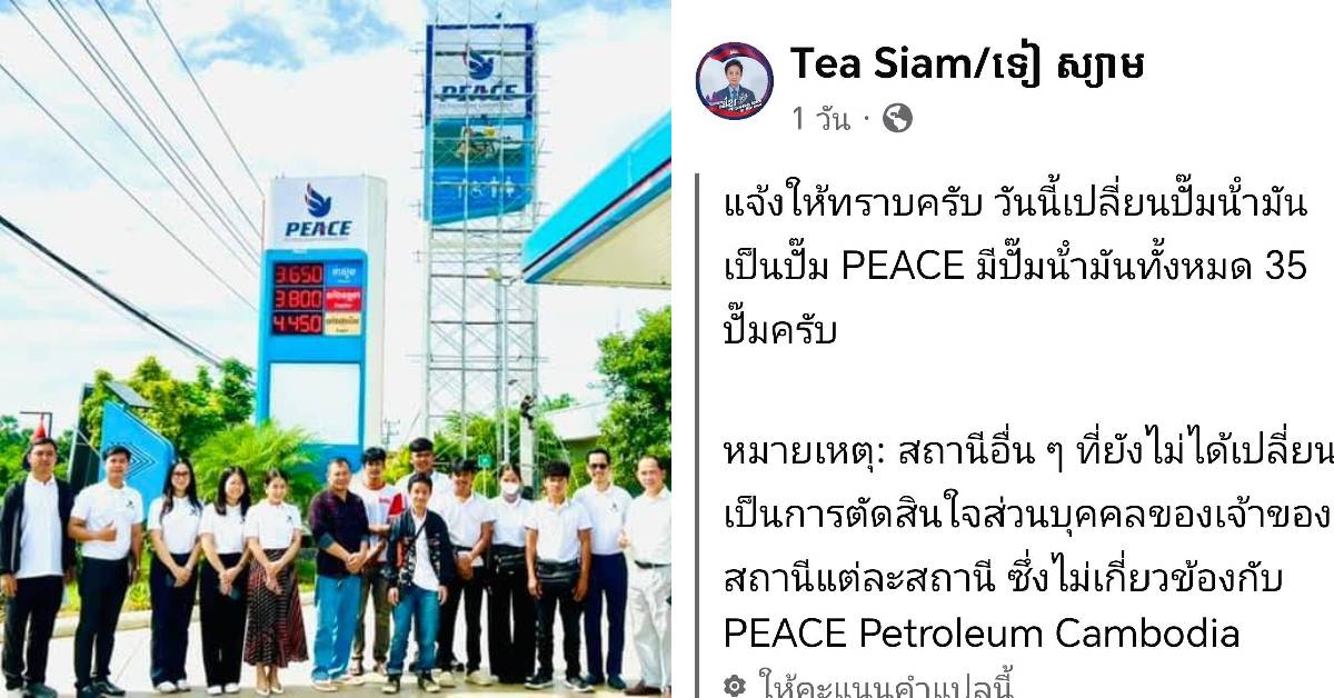 กรุงเทพฯ 29 ส.ค. – ปั๊ม ปตท.(PTT) กัมพูชา ถูกเปลี่ยนชื่อเป็น “พีช ปิโตรเลียม แคมโบเดีย” (PEACE Petroleum Cambodia) หรือ PPC 35 แห่ง จากทั้งหมด 200 แห่ง