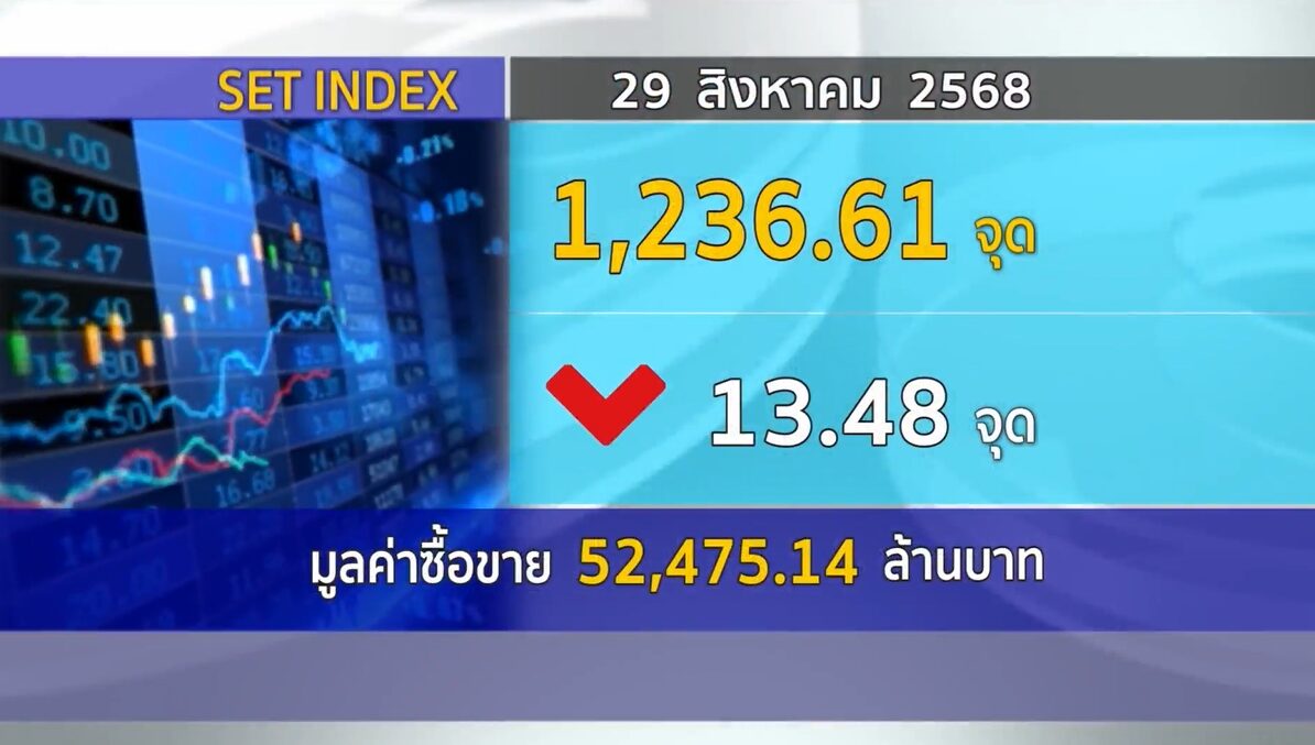 กทม. 29 ส.ค.-SET ปิดวันนี้ที่ 1,236.61 จุด ลดลง 13.48 จุด (-1.08%) มูลค่าซื้อขาย 52,475.14 ล้านบาท