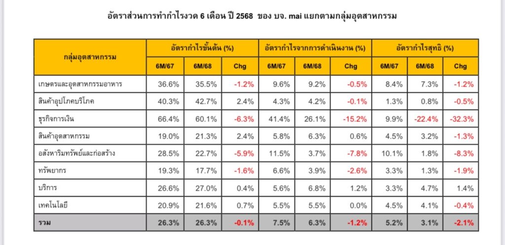 นายประพันธ์ เจริญประวัติ ผู้จัดการตลาดหลักทรัพย์เอ็ม เอ ไอ (mai) เปิดเผยว่า บริษัทจดทะเบียนใน mai จำนวน 218 บริษัท คิดเป็น 97% จากทั้งหมด 225บริษัท (ไม่รวมบริษัทในกลุ่มที่เข้าข่ายอาจถูกเพิกถอน หรือ NC และบริษัทที่ปิดงบไม่ตรงงวด) นำส่งผลการดำเนินงาน โดย 6 เดือนแรกของปี 2568 เปรียบเทียบกับปีก่อน มียอดขายรวม 100,869 ล้านบาท ลดลง3.9% ต้นทุนขาย 74,388 ล้านบาท ลดลง 3.8% กำไรขั้นต้น 26,482 ล้านบาท ลดลง 4.1% อย่างไรก็ตาม ค่าใช้จ่ายในการขายและบริหารเพิ่มขึ้น 2% ส่งผลให้มีกำไรจากการดำเนินงาน 6,356 ล้านบาท ลดลง 19.3% และมีกำไรสุทธิรวม 3,195 ล้านบาท ลดลง 42.7%เนื่องจากกำไรสุทธิของ บจ. บางแห่งลดลงอย่างมีนัยสำคัญ ทั้งนี้ หากพิจารณาความสามารถในการทำกำไรพบว่า บจ. ยังรักษาระดับ GPM ในระดับเท่าเดิมที่ 26.3% ขณะที่ OPM และ NPM ลดลงมาอยู่ที่ระดับ 6.3% และ 3.1% ตามลำดับ