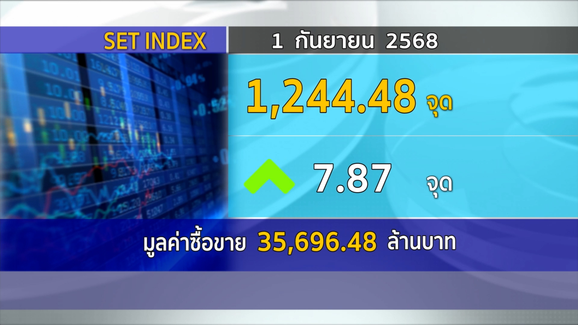กทม. 1 ก.ย.- SET ปิดวันนี้ที่ 1,244.48 จุด เพิ่มขึ้น 7.87 จุด (+0.64%) มูลค่าซื้อขาย 35,696.48 ล้านบาท
