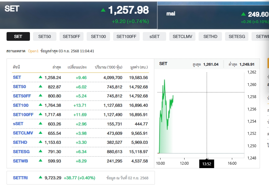 ดัชนีหุ้นไทยภาคเช้า บวกได้กว่า 10 จุด และเมื่อเวลา 11.04 น. ย่อลง โดยดัชนี SET มาอยู่ที่ 1,258.24 จุด เพิ่มขึ้น 9.46 จุด นายวิจิตร อารยะพิศิษฐ นักกลยุทธ์การลงทุน บล.ลิเบอเรเตอร์ กล่าวว่า ดัชนีหุ้นไทยปรับตัวขึ้นหลังจากสถานการณ์การเมืองในประเทศชัดเจน ทั้งพรรคประชาชนมีมติสนับสนุนโหวตเลือกนายอนุทิน ชาญวีรกูล หัวหน้าพรรคภูมิใจไทย เป็นนายกรัฐมนตรี ขณะที่พรรคเพื่อไทยได้ยื่นยุบสภา โดย 2 ทางเลือกนี้ทำให้นักลงทุนมีความชัดเจนว่า ไม่ว่าจะเป็นทางใดการเปลี่ยนแปลงก็จะเกิดขึ้น หากยุบสภาก็จะเลือกตั้งได้เร็วกว่า 4 เดือน ซึ่งเป็นเงื่อนไขของพรรคประชาชน เรื่องนี้จะเป็นผลระยะสั้นต่อตลาดหุ้นเป็นเชิงบวก ก็หาโอกาสจังหวะตั้งรับ และระยะกลางจะดีดกลับ แต่ทั้งนี้ให้รอดูสัญญาณของนักลงทุนต่างชาติและสถาบันว่าจะมีแรงขายหรือไม่ เพราะมีบางส่วนก็ไม่ได้ชื่นชอบภาวะการเมืองแบบนี้