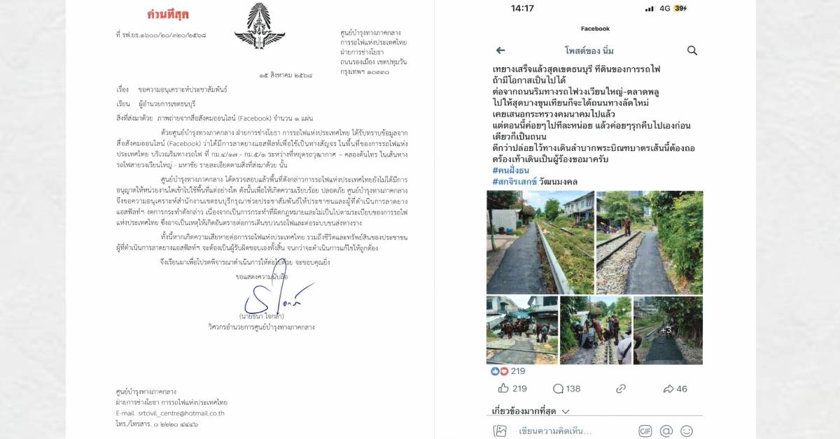 4 ก.ย. – การรถไฟฯ ตรวจสอบข้อเท็จจริง กรณีลาดยางแอสฟัลท์ในพื้นที่รถไฟ ระหว่างที่หยุดรถวุฒากาศ – คลองต้นไทร ชี้ผิดกฎหมาย และไม่ได้รับอนุญาต พร้อมร่อนหนังสือแจ้ง ผอ.เขตธนบุรี ประชาสัมพันธ์ให้หยุดการกระทำดังกล่าวทันที