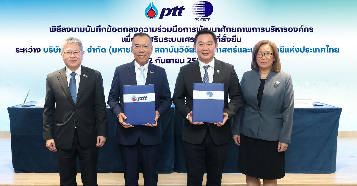 บริษัท ปตท. จำกัด (มหาชน) หรือ ปตท. และสถาบันวิจัยวิทยาศาสตร์และเทคโนโลยีแห่งประเทศไทย (วว.) ร่วมลงนามบันทึกข้อตกลงความร่วมมือการพัฒนาศักยภาพการบริหารองค์กร เพื่อส่งเสริมระบบเศรษฐกิจที่ยั่งยืน โดยมีนายวุฒิกร สติฐิต ประธานเจ้าหน้าที่ปฏิบัติการกลุ่มธุรกิจปิโตรเลียมขั้นต้นและก๊าซธรรมชาติ บริษัท ปตท. จำกัด (มหาชน) และ ผศ.ดร.วีรชัย อาจหาญ ผู้ว่าการสถาบันวิจัยวิทยาศาสตร์และเทคโนโลยีแห่งประเทศไทย ร่วมลงนาม พร้อมด้วย นายรัตติกูล ปิยะวงค์วาณิชย์ ผู้ช่วยกรรมการผู้จัดการใหญ่ รักษาการ รองกรรมการผู้จัดการใหญ่วิศวกรรมโครงการและการปฏิบัติการสู่ความเป็นเลิศ ปตท. และ ดร.จิตรา ชัยวิมล รองผู้ว่าการยุทธศาสตร์และจัดการนวัตกรรม วว. ร่วมเป็นสักขีพยาน