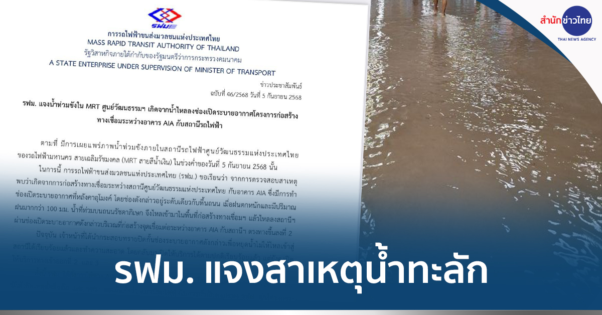 5 ก.ย.- รฟม. แจงน้ำท่วมขังใน MRT ศูนย์วัฒนธรรมฯ เกิดจากน้ำไหลลงช่องเปิดระบายอากาศโครงการก่อสร้างทางเชื่อมระหว่างอาคาร AIA กับสถานีรถไฟฟ้า