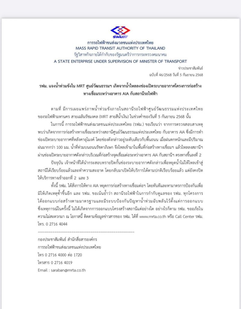 ตามที่ มีการเผยแพร่ภาพน้ำท่วมขังภายในสถานีรถไฟฟ้าศูนย์วัฒนธรรมแห่งประเทศไทย ของรถไฟฟ้ามหานคร สายเฉลิมรัชมงคล (MRT สายสีน้ำเงิน) ในช่วงค่ำของวันที่ 5 กันยายน 2568 นั้น