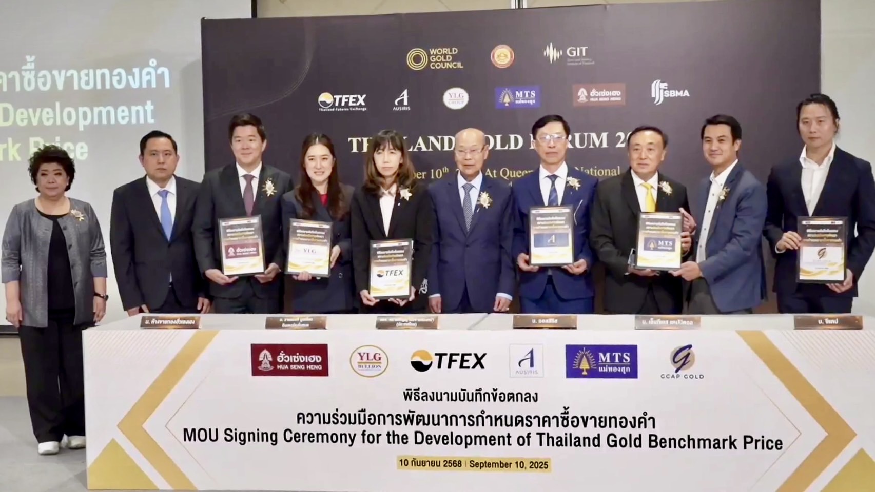 ดร. รินใจ ชาครพิพัฒน์ กรรมการผู้จัดการ บมจ. ตลาดสัญญาซื้อขายล่วงหน้า (ประเทศไทย) (TFEX) พร้อมด้วยผู้ประกอบการค้าทองคำ 5 ราย ได้แก่ บริษัท ออสสิริส จำกัด บริษัท ห้างขายทองฮั่วเซงเฮง จำกัด บริษัท เอ็มทีเอส แคปปิตอล จำกัด บริษัท วายเเอลจี บูลเลี่ยน อินเตอร์เนชั่นเเนล จำกัด และ บริษัท จีแคป จำกัด ร่วมลงนามบันทึกข้อตกลงความร่วมมือ (MOU) การพัฒนาการกำหนดราคาซื้อขายทองคำ (Gold Benchmark Price) โดยมี นายจิตติ ตั้งสิทธิ์ภักดี นายกสมาคมค้าทองคำ ร่วมเป็นสักขีพยาน ภายในงาน Thailand Gold Forum 2025 จัดโดย สมาคมค้าทองคำ ร่วมกับ สภาทองคำโลก (World Gold Council) และสถาบันวิจัยและพัฒนาอัญมณีและเครื่องประดับแห่งชาติ (องค์การมหาชน)