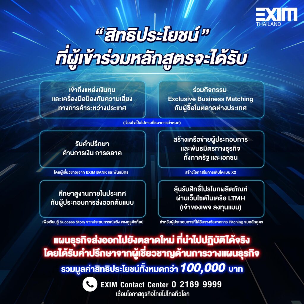 สิทธิประโยชน์สำหรับผู้ประกอบการที่ผ่านการคัดเลือกเพียง 50 ท่านจะได้รับคำปรึกษาด้านการเงิน การตลาดจากผู้เชี่ยวชาญของ EXIM BANK และหน่วยงานพันธมิตร สร้างโอกาสการเติบโตแบบ X2 ผ่านเครือข่ายผู้ประกอบการพันธมิตรทางธุรกิจทั้งภาครัฐและภาคเอกชน ศึกษาดูงานจากประสบการณ์จริง และลุ้นรับสิทธิประชาสัมพันธ์ผลิตภัณฑ์ผ่านเว็บไซต์ในเครือ LTMH (เจ้าของเพจลงทุนแมน)