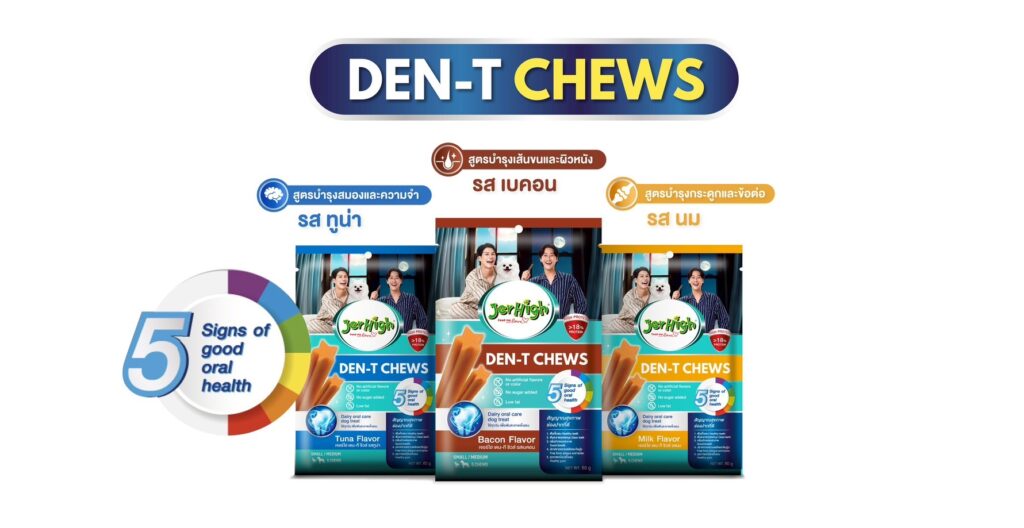 นายกิติศักดิ์ ลิ้มอำไพ กรรมการผู้จัดการ บริษัท อินเตอร์เนชั่นแนล เพ็ท ฟู้ด จำกัด ผู้ผลิตอาหารและขนมสุนัขเกรดพรีเมียม แบรนด์ “เจอร์ไฮ” และอาหารเปียกสำหรับน้องแมวอย่าง “จินนี่” เปิดเผยว่า บริษัทฯ ได้เปิดตัวผลิตภัณฑ์ใหม่ JerHigh Den-T Chews ขนมขัดฟันบำรุงสุขภาพสุนัข สูตร Co-Creation กับพี่จอง&คัลแลน เพื่อช่วยดูแลสุขภาพช่องปากน้องหมาอย่างครบวงจร ออกแบบมาเพื่อตอบโจทย์น้องหมาทุกสายพันธุ์ เคี้ยวสนุก อร่อยเพลิน ถือเป็นอีก 1 ตัวช่วยในการขัดฟันและช่วยลดการสะสมของคราบหินปูนได้ในเวลาเดียวกัน