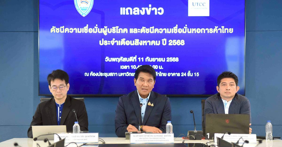 ศูนย์พยากรณ์เศรษฐกิจและธุรกิจ มหาวิทยาลัยหอการค้าไทย เปิดเผยผลสำรวจความเชื่อมั่นของผู้บริโภคในเดือนสิงหาคม 2568 ดัชนีความเชื่อมั่นของผู้บริโภคปรับตัวลดลงทุกรายการต่อเนื่อง เป็นเดือนที่ 7 และอยู่ในระดับที่ต่ำสุดในรอบ 32 เดือน นับตั้งแต่เดือนมกราคม 2566 เป็นต้นมา เนื่องจากผู้บริโภคมีความกังวลเกี่ยวกับความไม่แน่นอนทางการเมืองหลังจากศาลรัฐธรรมนูญ ได้วินิจฉัยให้นายกฯ แพทองธาร ชินวัตร พ้นตำแหน่งนายกรัฐมนตรี ผลกระทบจากสงครามการค้าที่สหรัฐฯ ได้ลดอัตราภาษีนำเข้าลงจาก 36% มาเหลือ 19% และสถานการณ์ความขัดแย้งระหว่างไทยกับกัมพูชา ส่งผลให้ผู้บริโภครู้สึกว่าเศรษฐกิจไทยกำลังชะลอตัวอย่างต่อเนื่อง และฟื้นตัวได้ช้า