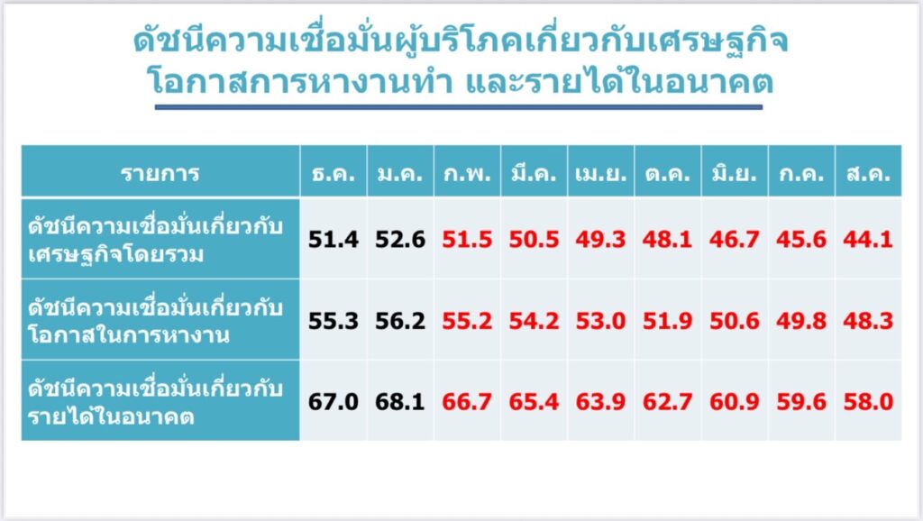 ทั้งนี้ ดัชนีความเชื่อมั่นเกี่ยวกับเศรษฐกิจโดยรวม ดัชนีความเชื่อมั่นเกี่ยวกับโอกาสหางานทำโดยรวม และดัชนีความเชื่อมั่นเกี่ยวกับรายได้ในอนาคตอยู่ที่ระดับ 44.1 48.3 และ 58.0 ตามลำดับ ปรับตัวลดลงทุกรายการต่อเนื่องเป็นเดือนที่ 7 โดยปรับตัวลดลงเมื่อเทียบกับดัชนีในเดือนกรกฎาคม ที่อยู่ในระดับ 45.6 49.8 และ 59.6 ตามลำดับ การที่ดัชนียังอยู่ในระดับต่ำกว่าปกติ (ที่ระดับ 100) แสดงว่า ผู้บริโภคยังไม่มีความมั่นใจเกี่ยวกับสถานการณ์ทางเศรษฐกิจ โอกาสในการหางานทำ และรายได้ในอนาคต เพราะมีความกังวลเกี่ยวกับสถานการณ์การเมืองในประเทศ และค่าครองชีพที่ยังทรงตัวอยู่ในระดับสูง ตลอดจนปัญหาเศรษฐกิจโลกที่มีความเสี่ยงเข้าสู่ภาวะชะลอตัวลงจากสงครามการค้าที่กำลังเกิดขึ้น ซึ่งจะส่งผลกระทบให้เศรษฐกิจไทยและการจ้างงานมีโอกาสฟื้นตัวได้ช้าในอนาคต ซึ่งจะทำให้รายได้ในอนาคตของผู้บริโภคมีความไม่แน่นอนสูง