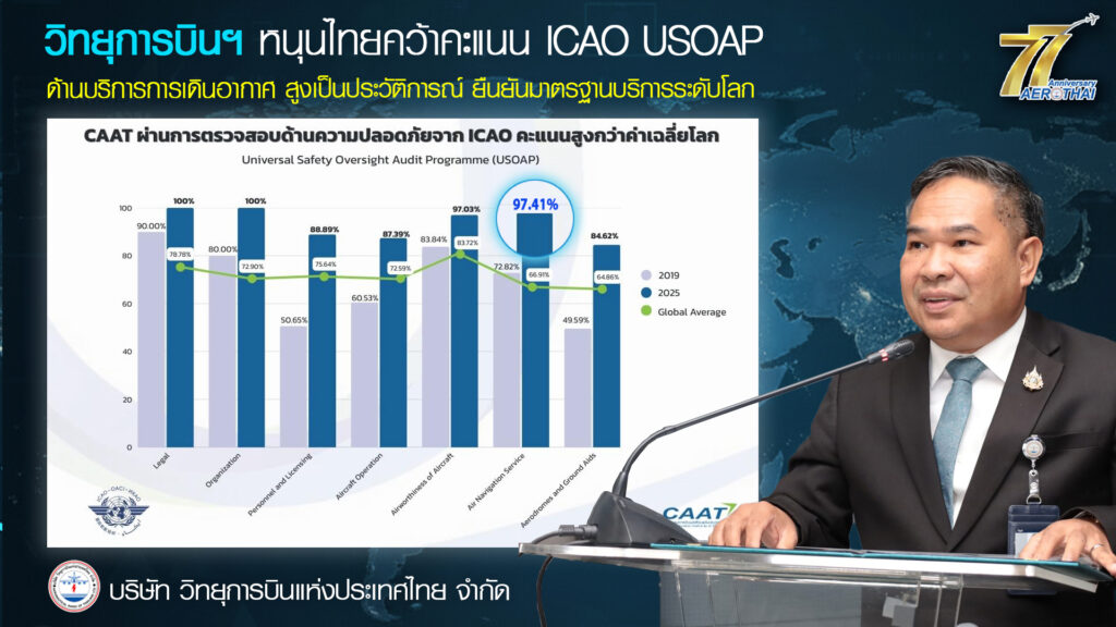กรุงเทพ 11 ก.ย. – วิทยุการบินฯ ย้ำมาตรฐานความปลอดภัยระดับสากล จากผลตรวจ ICAO USOAP ด้านบริการการเดินอากาศของไทย ได้คะแนน 97.41% สูงกว่าค่าเฉลี่ยโลก 30% รักษามาตรฐานพร้อมเพิ่มประสิทธิภาพการให้บริการสู่การเป็นศูนย์กลางการบินภูมิภาค