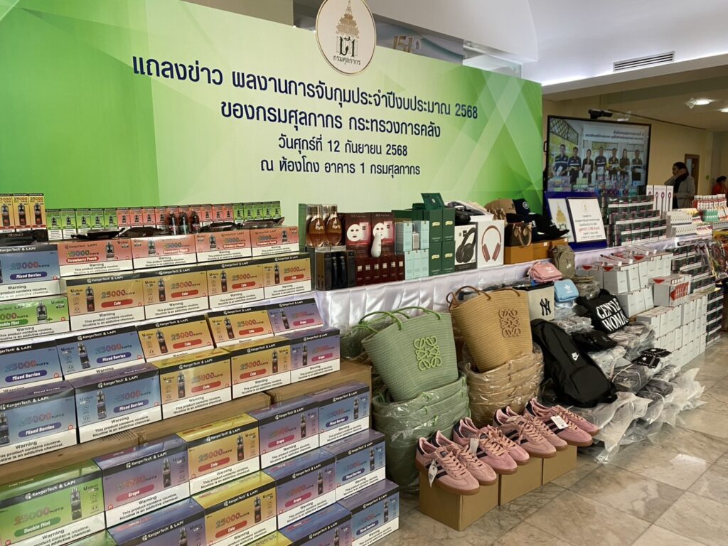 นายธีรัชย์ อัตนวานิช อธิบดีกรมศุลกากร พร้อมด้วยผู้บริหาร แถลงผลการจับกุมการกระทำความผิดในการลักลอบนำเข้าและส่งออกสินค้า ตามนโยบายรัฐบาล ในปีงบประมาณปี 68 อาทิ ยาเสพติด บุหรี่ บุหรี่ไฟฟ้า อุปกรณ์บุหรี่ไฟฟ้า น้ำยาบุหรี่ไฟฟ้า สินค้าที่ไม่มีใบอนุญาต สินค้าละเมิดทรัพย์สินทางปัญญา มูลค่า 2,709 ล้านบาท