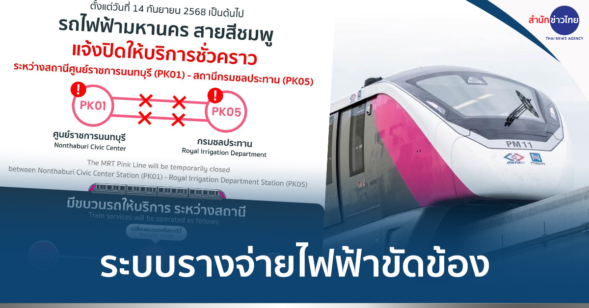 14 ก.ย.- รถไฟฟ้าสายสีชมพู ระบบรางจ่ายไฟฟ้าขัดข้อง ปิดให้บริการชั่วคราวตั้งแต่สถานีศูนย์ราชการนนทบุรี-สถานีกรมชลประทาน