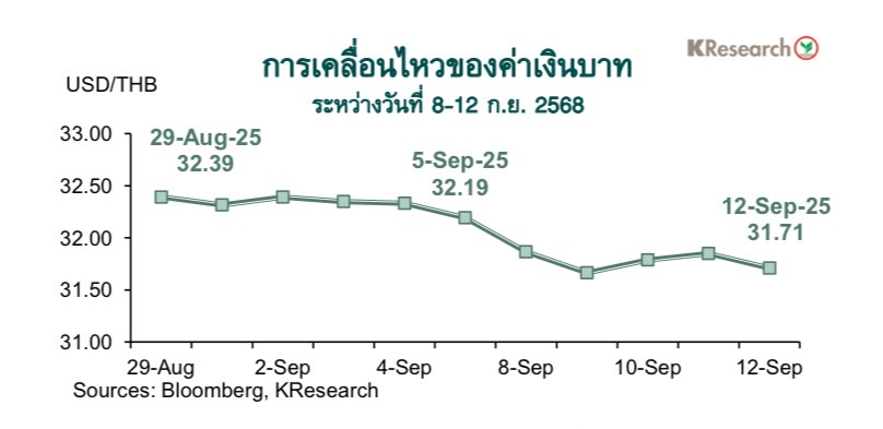 สัปดาห์นี้ (15-19 ก.ย.) ธนาคารกสิกรไทยมองกรอบการเคลื่อนไหวของค่าเงินบาทที่ระดับ 31.20-32.00 บาทต่อดอลลาร์ ขณะที่ศูนย์วิจัยกสิกรไทยประเมินปัจจัยสำคัญที่ต้องติดตาม ได้แก่ ผลการประชุมนโยบายการเงิน ประมาณการเศรษฐกิจและ dot plot ใหม่ของเฟด (16-17 ก.ย.) ทิศทางฟันด์โฟลว์ของต่างชาติและราคาทองคำในตลาดโลก ส่วนตัวเลขเศรษฐกิจสหรัฐที่สำคัญ ได้แก่ ยอดค้าปลีก การผลิตภาคอุตสาหกรรม ดัชนีราคานำเข้าและส่งออก ตัวเลขการเริ่มสร้างบ้านเดือน ส.ค. ผลสำรวจกิจกรรมภาคการผลิตของเฟดสาขานิวยอร์กและสาขาฟิลาเดลเฟีย และดัชนีตลาดที่อยู่อาศัยเดือน ก.ย. ตลอดจนจำนวนผู้ขอรับสวัสดิการว่างงานรายสัปดาห์ นอกจากนี้ตลาดยังรอติดตามผลการประชุม BOE (18 ก.ย.) และ BOJ (18-19 ก.ย.) ตัวเลขเศรษฐกิจเดือน ส.ค. ของจีน รวมถึงอัตราเงินเฟ้อเดือน ส.ค. ของอังกฤษ ยูโรโซน และญี่ปุ่น ด้วยเช่นกัน