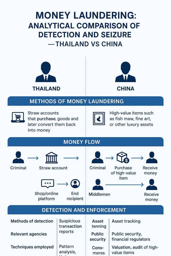 ในขณะที่การตรวจจับและความท้าทาย โดยไทยใช้บัญชีม้า การตรวจจับมุ่งเน้นที่การติดตามการเคลื่อนไหวของเงินในบัญชีม้าและรูปแบบการซื้อสินค้าที่ผิดปกติ, อุปสรรคหลักคือ บัญชีม้ามักเปิดด้วยบัตรประชาชนที่ถูกขโมยหรือเช่าจากประชาชนที่ขาดความรู้ ทำให้ติดตามตัวจริงยาก ซึ่งไทย เริ่มนำเทคโนโลยีมาใช้ แต่ยังขาดพัฒนาการใช้และเชื่อมต่อข้อมูลระหว่างสถาบันการเงินและแพลตฟอร์มการค้าออนไลน์อย่างเป็นระบบ