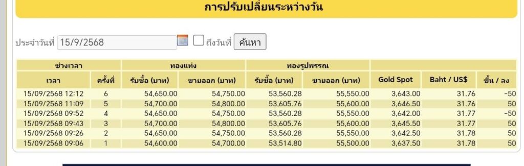 สมาคมค้าทองคำรายงาน ราคาทองวันนี้ (15 ก.ย.) เปิดตลาดราคาทอง ราคาทองปรับขึ้น 50 บาท ขายออกที่บาทละ 54,700 บาท โดยทองคำแท่ง ขายออกที่ 54,700 บาท ทองรูปพรรณ ขายออก 55,500 บาท ขณะที่ราคาทองคำตลาดโลก (Gold Spot) อยู่ที่ 3,637.50 เหรียญสหรัฐ/ออนซ์ ค่าเงินบาท 31.78 บาท/ดอลลาร์สหรัฐ อย่างไรก็ตาม ในช่วงครึ่งวัน จนถึงเวลา 12.12 น. ราคาทองคำปรับขึ้นลง 6 ครั้ง ขึ้นรวม 200 บาท และลดลงรวม 100 บาท ราคาทองคำแท่งขายออก 54,750 บาท ทองรูปพรรณ ขายออก 55,550 บาท