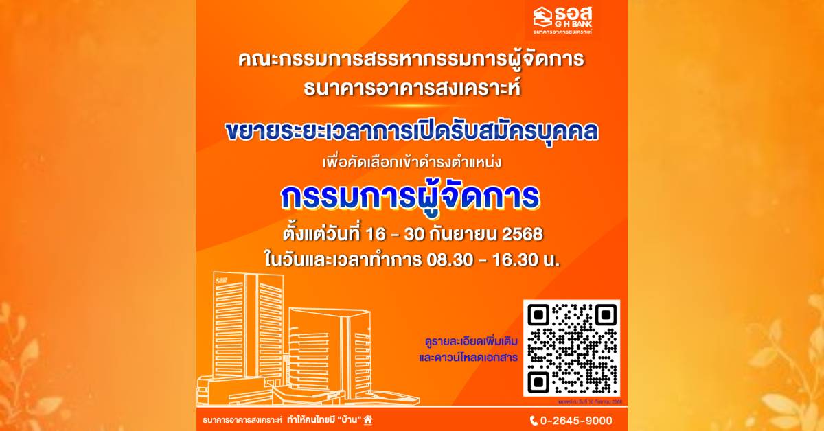 กรุงเทพฯ 15 ก.ย. – ธอส.ขยายเวลาเปิดรับสมัครกรรมการผู้จัดการธนาคารอาคารสงเคราะห์ วันที่ 16-30 กันยายน 68