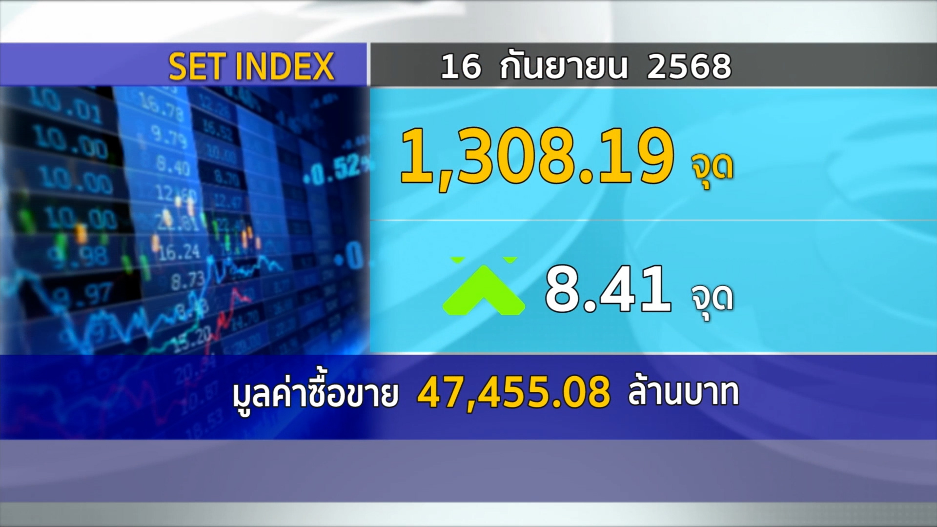 กทม. 16 ก.ย.- SET ปิดวันนี้ที่ 1,308.19 จุด เพิ่มขึ้น 8.41 จุด (+0.65%) มูลค่าซื้อขาย 47,455.08 ล้านบาท