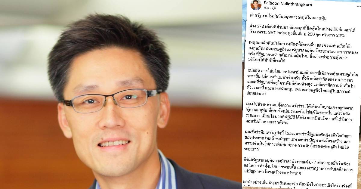 Paiboon Nalinthrangkurn ระบุว่าช่วง 2-3 เดือนที่ผ่านมา นักลงทุนที่ติดหุ้นไทยน่าจะเริ่มยิ้มออกได้บ้าง เพราะ SET Index พุ่งขึ้นเกือบ 250 จุด หรือราว 24% เหตุผลหลักคือปัจจัยการเมืองที่ชัดเจนขึ้น และความเชื่อมั่นที่นักลงทุนมีต่อทีมเศรษฐกิจของรัฐบาลอนุทิน โดยเฉพาะมาตรการคนละครึ่ง ที่รัฐบาลจะนำกลับมาปัดฝุ่นใหม่ ซึ่งน่าจะช่วยกระตุ้นการบริโภคได้ทันทีที่เริ่มใช้