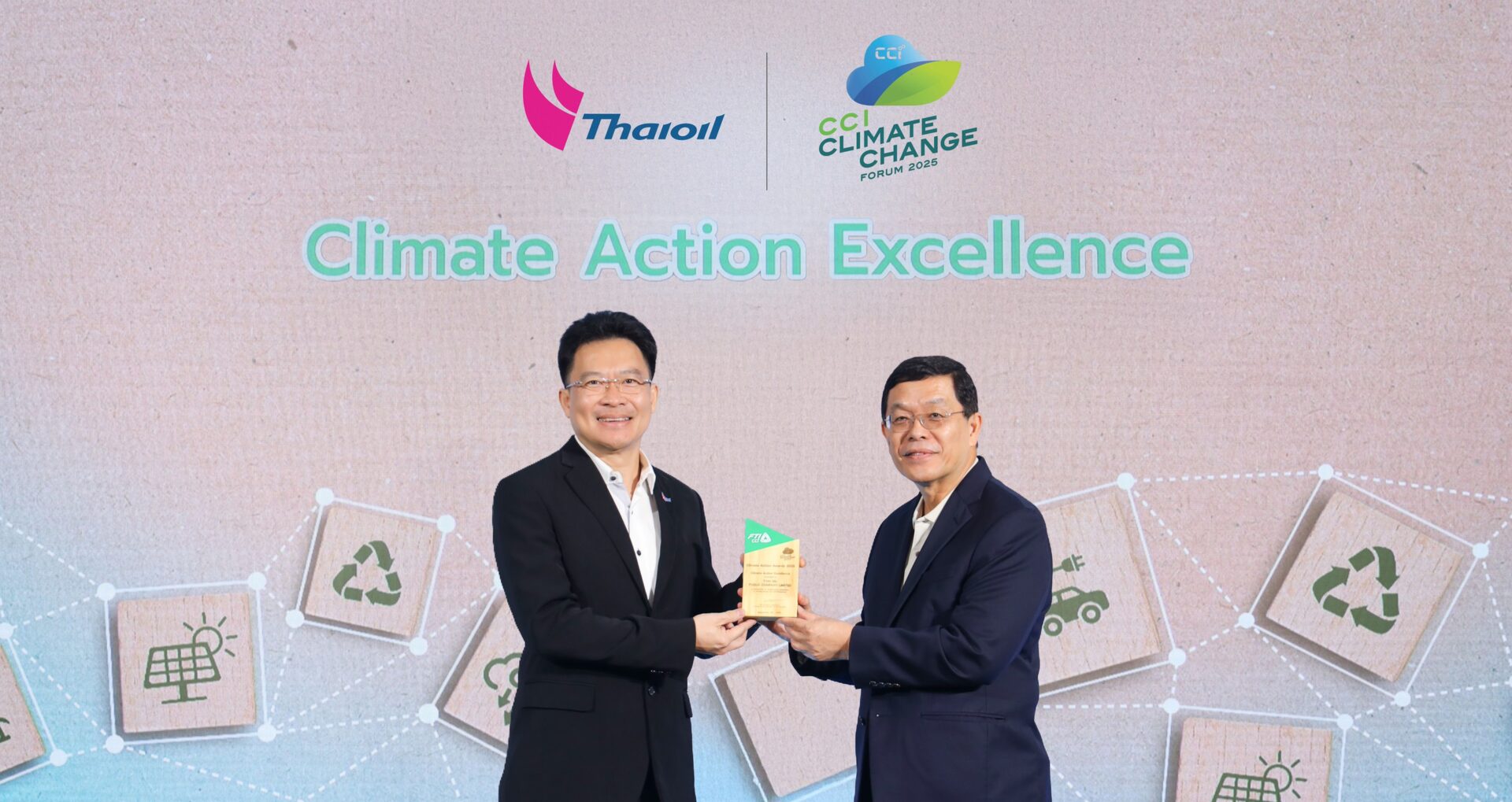กรุงเทพฯ 18 ก.ย.- เมื่อเร็วๆ นี้ นายภูพิงค์ ทวีทรัพย์ ผู้จัดการฝ่ายความยั่งยืนองค์กร บริษัท ไทยออยล์ จำกัด (มหาชน) รับมอบรางวัล Climate Action Excellence ซึ่งเป็นรางวัลระดับสูงสุดของรางวัล Climate Change Awards 2025 จากสถาบันการเปลี่ยนแปลงสภาพภูมิอากาศ สภาอุตสาหกรรมแห่งประเทศไทย โดยมีนายกิตติพงศ์ ลิ่มสุวรรณโรจน์ กรรมการบริหารและประธาน Climate Change Pillar สภาอุตสาหกรรมแห่งประเทศไทย เป็นประธาน