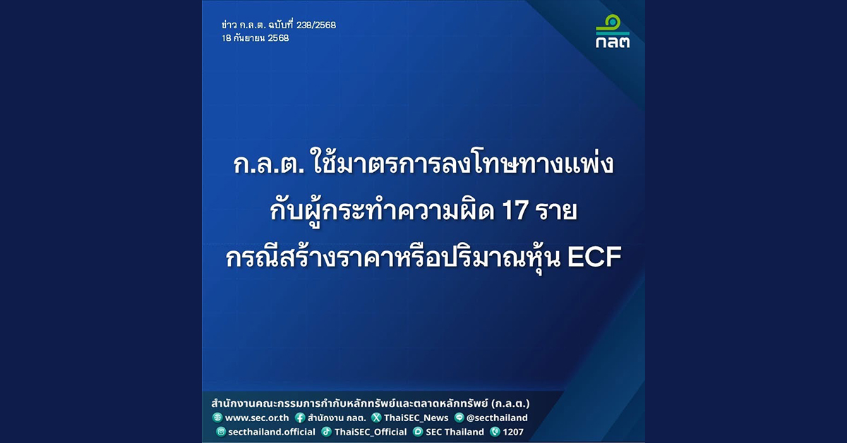 กรุงเทพฯ 18 ก.ย.- ก.ล.ต. ลงโทษทางแพ่งกับผู้กระทำความผิด 17 ราย กรณีสร้างราคาหรือปริมาณหุ้นของ บมจ.ริษัท อีสต์โคสท์เฟอร์นิเทค (ECF) โดยเรียกให้ชำระเงินรวม 264,791,946 บาท พร้อมกำหนดระยะเวลาห้ามซื้อขายหลักทรัพย์-สัญญาซื้อขายล่วงหน้า ห้ามเป็นกรรมการ-ผู้บริหาร