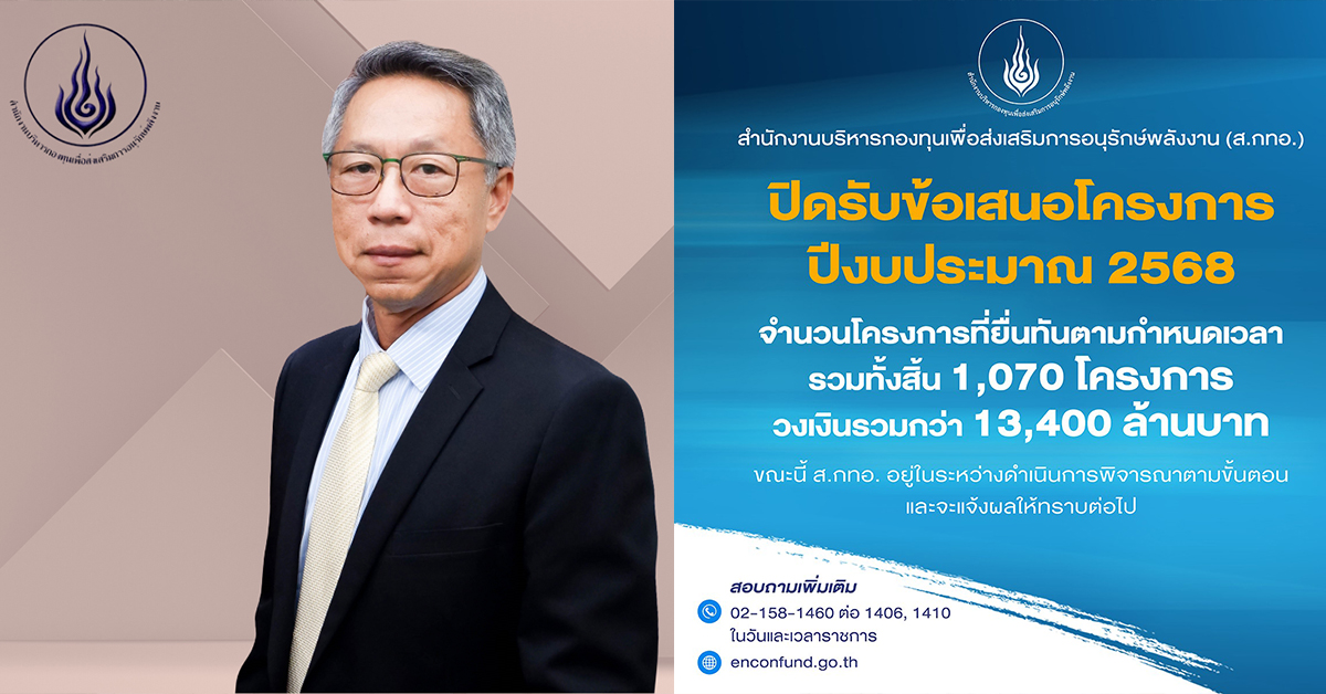 นายรัฐฉัตร ศิริพานิช ผู้จัดการสำนักงานบริหารกองทุนเพื่อส่งเสริมการอนุรักษ์พลังงาน (ส.กทอ.) เปิดเผยว่า ภายหลังจากที่คณะกรรมการกองทุนเพื่อส่งเสริมการอนุรักษ์พลังงานได้ขยายระยะเวลาการเปิดรับข้อเสนอโครงการ เพื่อรับคำขอรับการสนับสนุนเงินกองทุนเพื่อส่งเสริมการอนุรักษ์พลังงาน ประจำปีงบประมาณ พ.ศ. 2568 จนถึงวันที่ 17 กันยายน 2568 นั้น ขณะนี้ทางกองทุนฯ ได้ปิดรับข้อเสนอโครงการแล้ว โดยสรุปมีจำนวนโครงการที่ยื่นข้อเสนอเข้ามาทันตามกำหนดระยะเวลารวม 1,070 โครงการ รวมวงเงินกว่า 13,400 ล้านบาท โดยวงเงินที่มีหน่วยงานยื่นข้อเสนอเข้ามาสูงกว่างบประมาณที่ตั้งไว้ที่ 2,750 ล้านบาทถึงประมาณ 380% หรือเกือบ 4 เท่าตัว ซึ่งภายหลังจากนี้ ส.กทอ. จะเร่งดำเนินการและเสนอคณะกรรมการกองทุนเพื่อพิจารณาตามขั้นตอนต่อไป