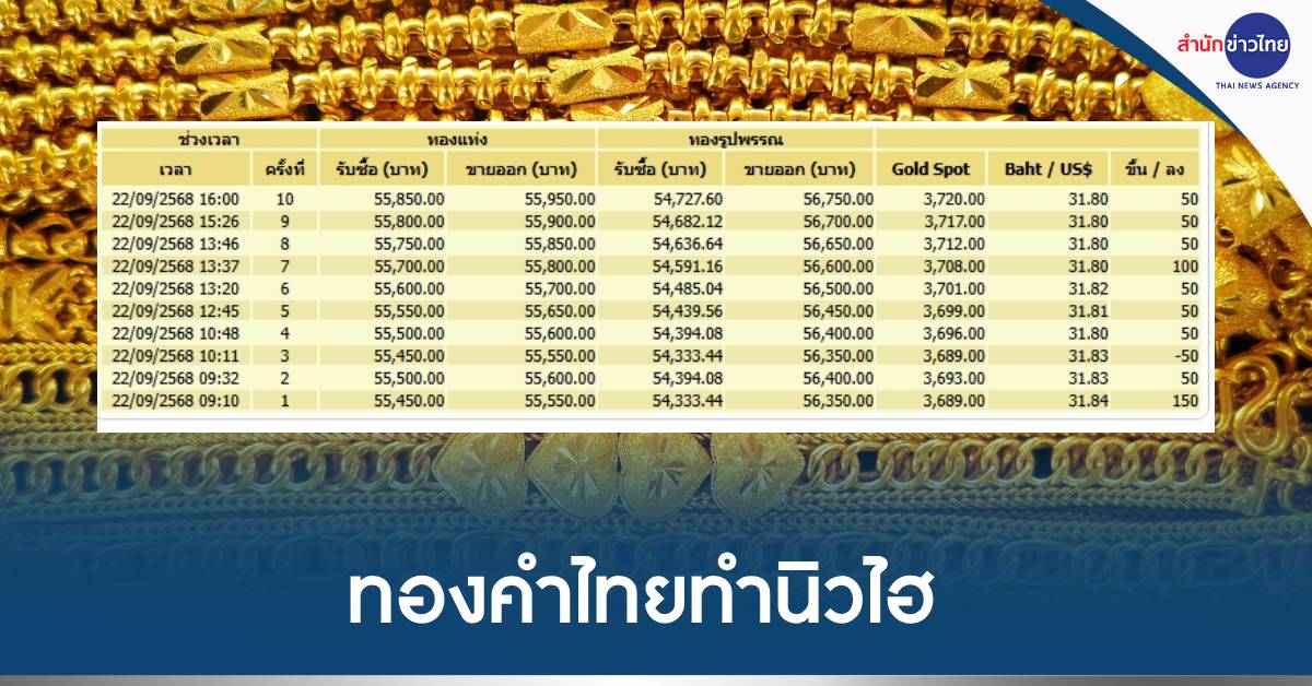 กรุงเทพฯ 22 ก.ย.-ทองคำไทย ทำสถิติสูงสุด ช่วงบ่าย ทองแท่ง ขายออกบาทละ 55,950 บาท ตามราคาตลาดโลกที่ยังพุ่งต่อเนื่อง