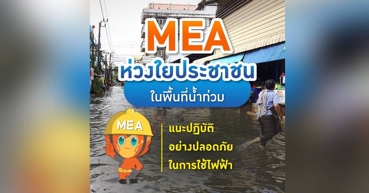 MEA หรือการไฟฟ้านครหลวง ห่วงใยพี่น้องประชาชนที่ได้รับผลกระทบจากสถานการณ์น้ำท่วมในหลายพื้นที่ ซึ่งเกิดจากภาวะฝนตกหนักและปริมาณน้ำที่เพิ่มสูงขึ้นอย่างต่อเนื่อง MEA ขอเตือนและแนะนำให้ประชาชนในเขตพื้นที่เสี่ยง หากระดับน้ำเริ่มท่วมสูงใกล้อุปกรณ์ไฟฟ้า ควรรีบย้ายปลั๊กไฟและเครื่องใช้ไฟฟ้าขึ้นที่สูง เพื่อป้องกันอันตรายจากไฟฟ้ารั่วและอุปกรณ์ชำรุด พร้อมติดตามสถานการณ์ข่าวสารอย่างใกล้ชิด
