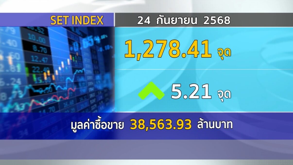 กทม. 24 ก.ย.-ตลาดหลักทรัพย์ฯ ปิดวันนี้ 1,278.41 จุด เพิ่มขึ้น 5.21 จุด (+0.41%) มูลค่าซื้อขาย 38,563.93 ล้านบาท