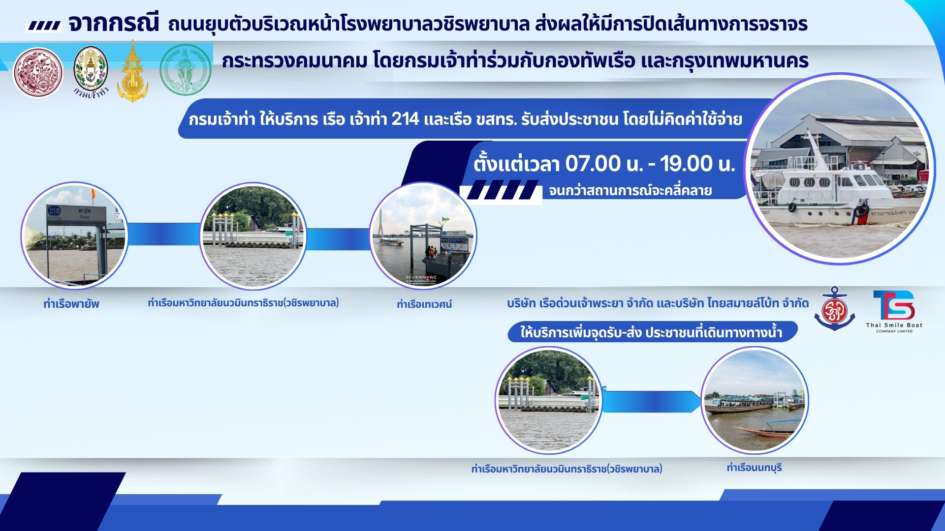 เนื่องจากเกิดเหตุถนนยุบตัวบริเวณหน้าโรงพยาบาลวชิรพยาบาล ส่งผลให้ต้องปิดเส้นทางการจราจรทางบกและกระทบต่อการเดินทางของประชาชน ผู้ป่วย และบุคลากรทางการแพทย์ กระทรวงคมนาคม โดยกรมเจ้าท่า ร่วมกับกองทัพเรือ และกรุงเทพมหานคร ได้ดำเนินมาตรการอำนวยความสะดวกประชาชน จัดเรือ “เจ้าท่า 214” และเรือ “ขส.ทร.” รับ-ส่งประชาชน โดยไม่คิดค่าใช้จ่าย ระหว่าง ท่าเรือพายัพ – ท่าเรือมหาวิทยาลัยนวมินทราธิราช (วชิรพยาบาล) – ท่าเรือเทเวศร์ ตั้งแต่เวลา 07.00 – 19.00 น. จนกว่าสถานการณ์จะคลี่คลาย