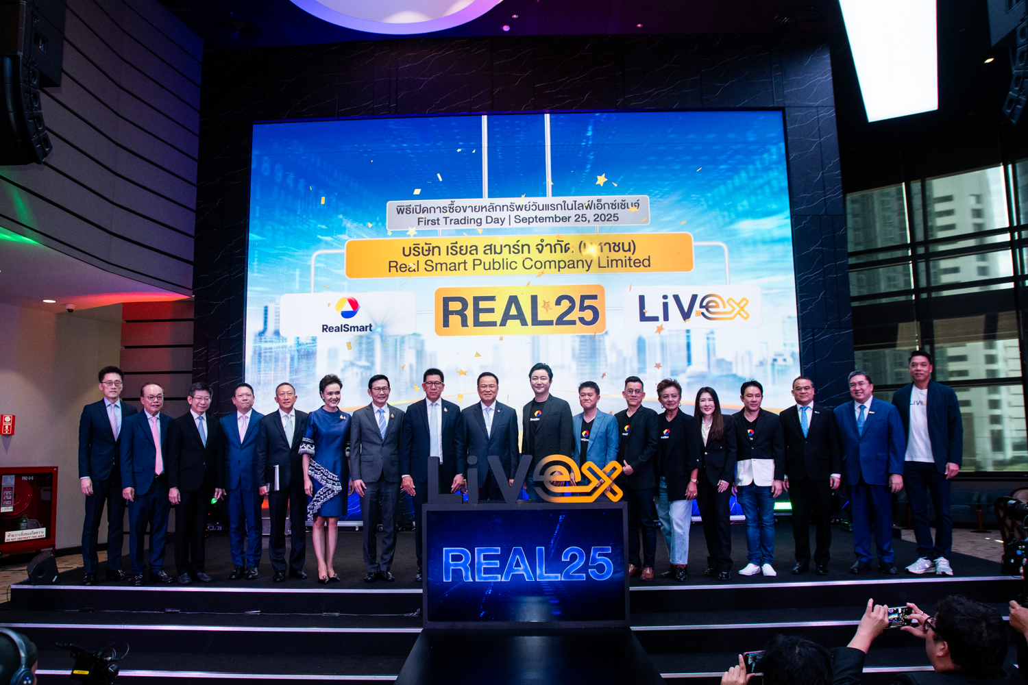 นายประพันธ์ เจริญประวัติ ผู้จัดการ ตลาดหลักทรัพย์ไลฟ์เอ็กซ์เช้นจ์ (LiVEx) พร้อมด้วย นายภูกิจ ดิศธรานนท์ ประธานเจ้าหน้าที่บริหาร บริษัท เรียล สมาร์ท จำกัด (มหาชน) ร่วมพิธีเปิดการซื้อขายหลักทรัพย์ วันแรกในไลฟ์เอ็กซ์เช่นจ์ของ บมจ. เรียล สมาร์ท โดยใช้ชื่อย่อในการซื้อขายหลักทรัพย์ว่า“REAL25” เปิดเทรดวันแรก ที่ 25.25 บาทเพิ่มขึ้น จากราคา IPO 21.13 บาท เพิ่มขึ้น 4.12 บาท หรือคิดเป็น 19.50% มีมูลค่าหลักทรัพย์ ณ ราคา IPO 722.17 ล้านบาท