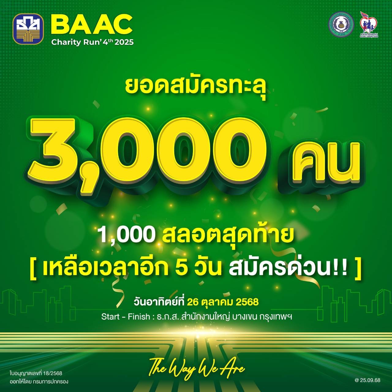 กรุงเทพฯ 26 ก.ย.-“BAAC Charity Run 2025” มีนักวิ่งสมัครเกิน 3,000 คนแล้ว!! สมัครด่วนก่อนเต็ม!! สมัครได้ถึง 30 ก.ย. นี้เท่านั้น