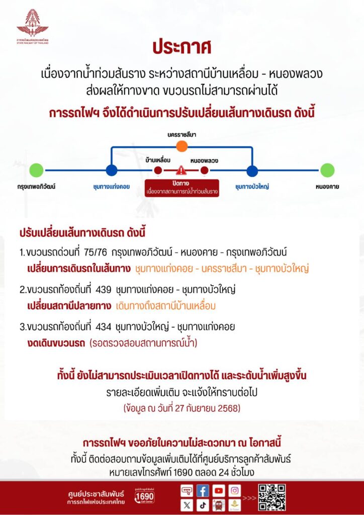 27 ก.ย. – การรถไฟแห่งประเทศไทย ประกาศแจ้งเหตุน้ำท่วมหนัก “ทางรถไฟขาด” ที่บ้านเหลื่อม จ.นครราชสีมา สั่งปรับแผนเดินรถ ขณะนี้ได้สั่งการและดำเนินการแก้ไขสถานการณ์ พร้อมปรับแผนการเดินรถเพื่อความปลอดภัยของผู้โดยสาร ดังนี้