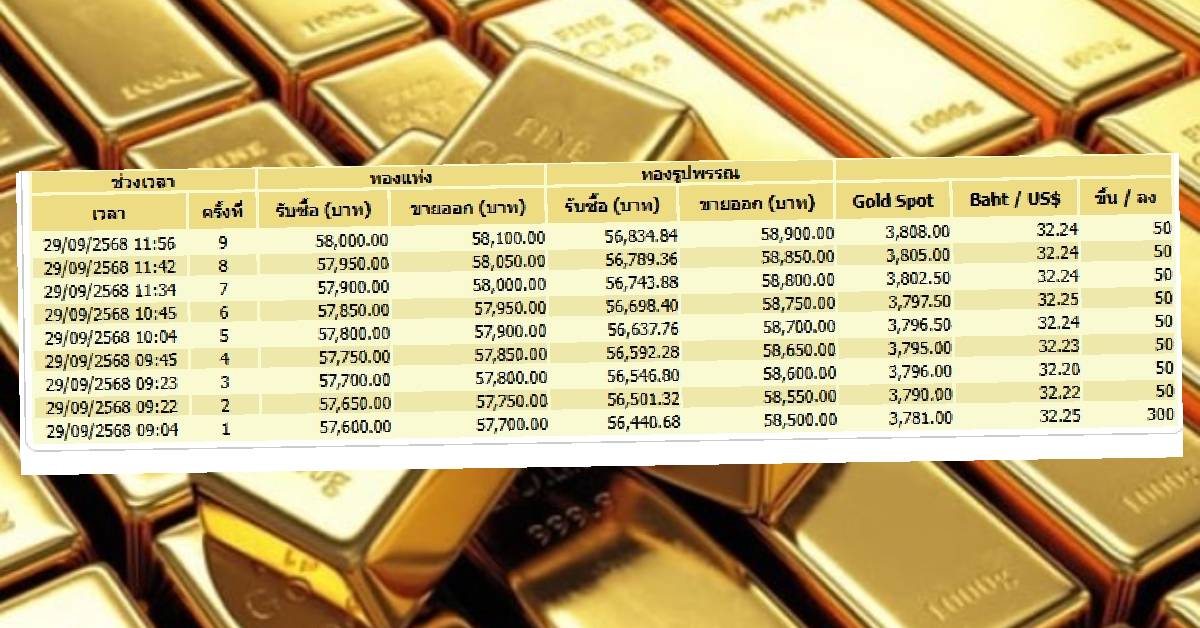 สมาคมค้าทองคำรายงาน ว่าราคาทองคำในเช้าวันนี้ จนถึง 11.56 น. ปรับขึ้นรวด 9 ครั้ง ราคาสร้างสถิติสูงสุด โดย ราคาทองแท่งขายออก บาทละ 58,100 บาท ทองรูปพรรณ ขายออก 58,900 บาท โดยอยู่บน อัตราแลกเปลี่ยนทิศทางอ่อนค่า 32.24 บาท/ดอลลาร์สหรัฐ ราคาทอง Gold SPOT 3,808 ดอลลาร์สหรัฐ/ออนซ์