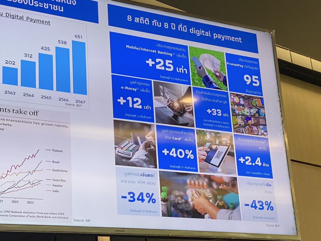 นางสาวดารณี แซ่จู ผู้ช่วยผู้ว่าการ ธนาคารแห่งประเทศไทย (ธปท.) กล่าวในหัวข้อ “ทิศทางการพัฒนาระบบการชำระเงินไทย (Payment Directional Paper)” ว่า ในช่วง 8 ปีที่ผ่านมา Digital Payment ของไทยก้าวหน้าไปมาก ทำให้ปริมาณธุรกรรมทางการเงินผ่านโมบายแบงกิ้งเพิ่ม 25 เท่า , ปริมาณธุรกรรมผ่านโอนผ่านพร้อมเพย์ 95 ล้านรายการต่อวัน ,ธุรกรรมผ่าน e-money เพิ่มขึ้น 12 เท่า , ร้านค้ารับชำระเงินด้วย QR-Code เพิ่มขึ้น 33 เท่า , มูลค่าชำระเงินด้วยบัตรเพิ่มขึ้น 40% , ขณะที่การใช้เงินสดผ่านสาขาและ ATM ลดลง -34% ,ยอดการใช้เช็คลดลง -43% ทำให้ลดต้นทุนการผลิตธนบัตรได้มากขึ้น