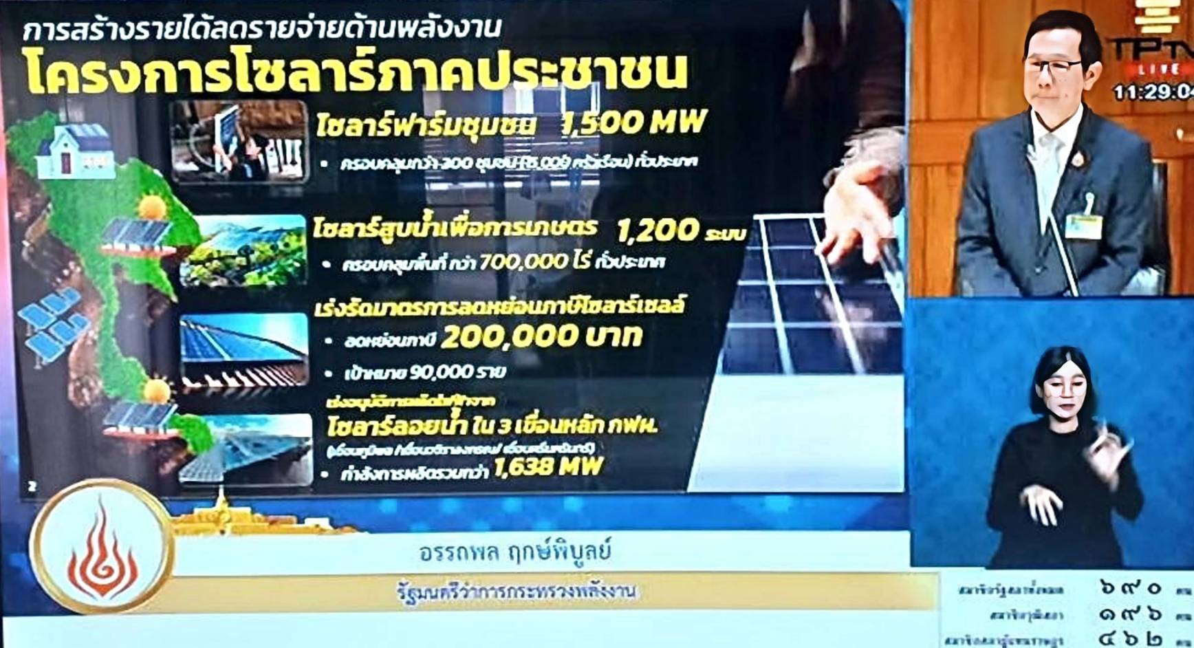 3.สร้างความยั่งยืนระยะยาวรองรับ ซึ่งกระทรวงพลังงานจะเดินหน้าผลักดันและก้าวไปสู่ Net Zero 2050 ซึ่งในโครงการโซลาร์ประชาชน จะสามารถช่วยลดการปล่อยคาร์บอนไดออกไซด์ ได้กว่า 3.6 ล้านตันคาร์บอนไดออกไซด์ต่อปี รวมถึงเร่งจัดทำแผนพัฒนากำลังการผลิตไฟฟ้า (PDP) โดยทบทวนรายละเอียดแผน PDP ให้ตอบโจทย์กับเป้าหมายใหม่ Net Zero 2050 ให้เสร็จภายใน 4 เดือนนี้